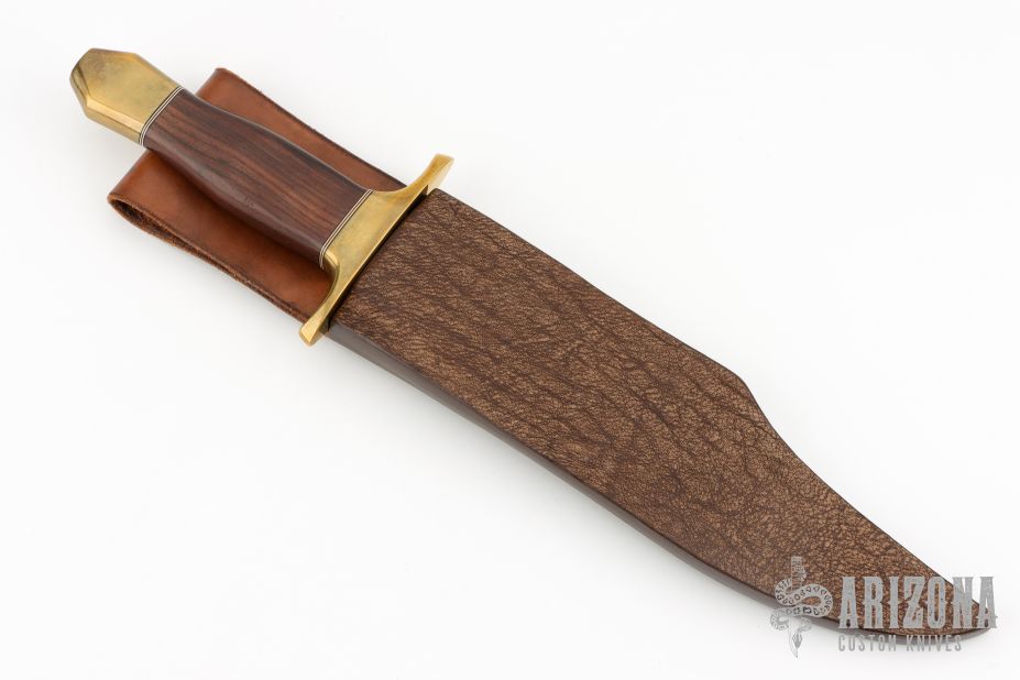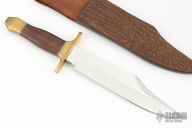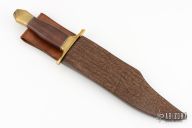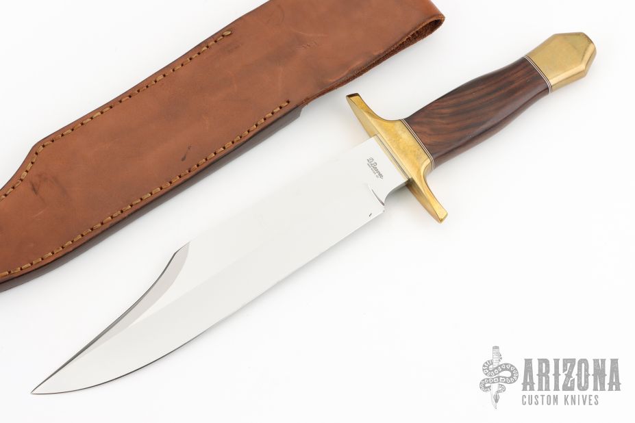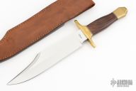 This Bowie by Devon Butch Beaver features mirror polished blade with false top edge, .250" blade stock and 1.963" blade depth, hidden tang construction. The handle has brass guard and butt, cocobolo grip with black/white/red spacers. Comes with a brown leather sheath and a zippered case. Excellent condition.