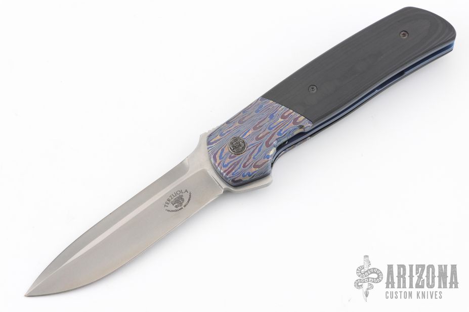 Bob Terzuola was born in Brooklyn, New York and attended New York University. Upon graduation in 1967 he went to Panama as a Peace Corps trainer and later became a jade carver and gemologist in the Motagua River Valley, Guatemala. In 1979, Terzuola began making knives and joined the Knifemakers' Guild in 1981 on an endorsement from Bob Loveless. Terzuola's first knives were fixed blade designs made for soldiers in Guatemala. Later that year moved to New Mexico and began making folding knives. Seeing a need for a knife that could be carried discreetly, he developed a model featuring black micarta for the scales and bead-blasted titanium bolsters. Innovations in desgin for which he coined the term "Tactical Knife". Bob attends many of the largest and well known custom knife shows across the world. Bob Terzuola Knives are known for their trademark design and high quality workmanship. Terzuola's most popular model is the ATCF, a folding knife design. This was his first tactical folding knife, although he also makes it with non-tactical materials. Other knife models that Bob Terzuola is popular for are the 3A, TT-1, Model 7, Eagle Rock 514, TTF3A, Model 26, Starmate, TTF3B, Pathfinder, Century Starfighter, Starmate, Battle Guard, TTF6, Model 18 Combat Master, WEE T, and Battle Mate, just to name a few. Bob Terzuola also designed a very popular knife for Spyderco, the SLIPIT. The SPLIT is made of the finest non-locking tactical folders on the market. Bob Terzuola has authored a book about the design of tactical knives named, 'The Tactical Folding Knife.' When you hear people say that Bob Terzuola literally wrote the book on tactical folding knives, he really did! Many custom tactical knifemakers have his book in their shop, and highly value his opinions and designs. Bob Terzuola has also authored articles about tactical knives and knifemaking for Blade, Soldier of Fortune and other publications.