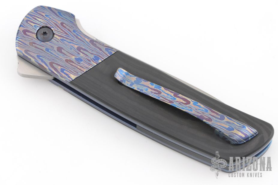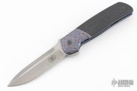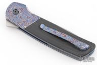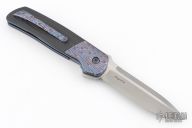 This ATCF Flipper by Bob Terzuola features a bead blast finished blade with notched thumbrest and flipper. The handle has timascus bolsters, unidirectional carbon fiber scales, tumbled and anodized titanium liners, black G-10 backspacer, timascus clip with hidden screws. Rides on bearings, nice detent, lockup and blade seating. Comes with a zippered case. Excellent condition.