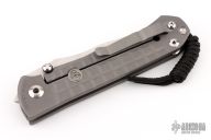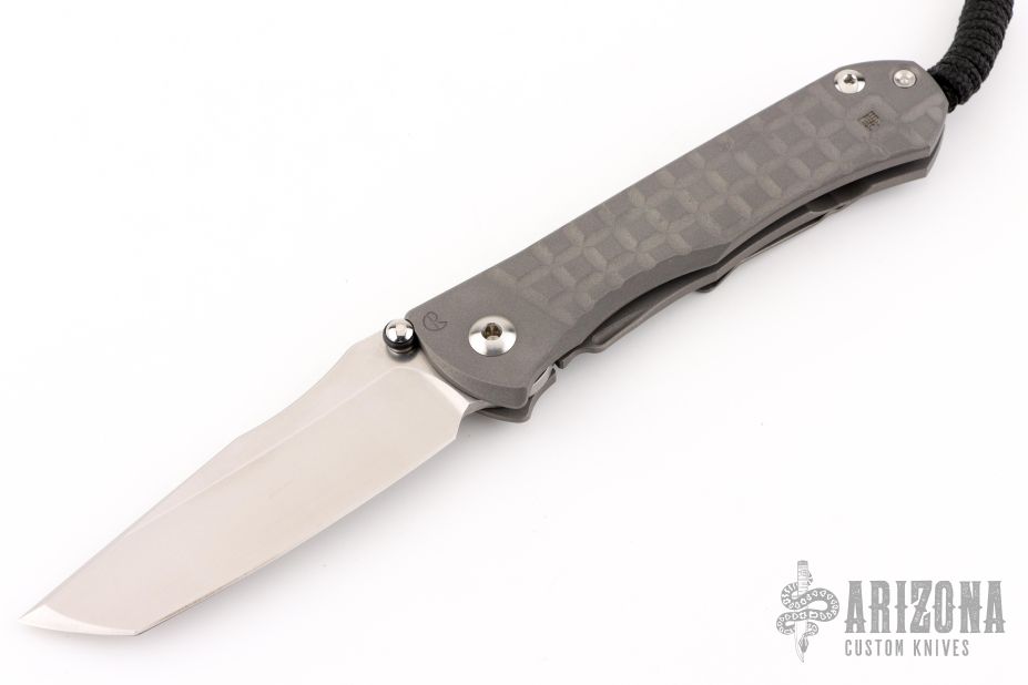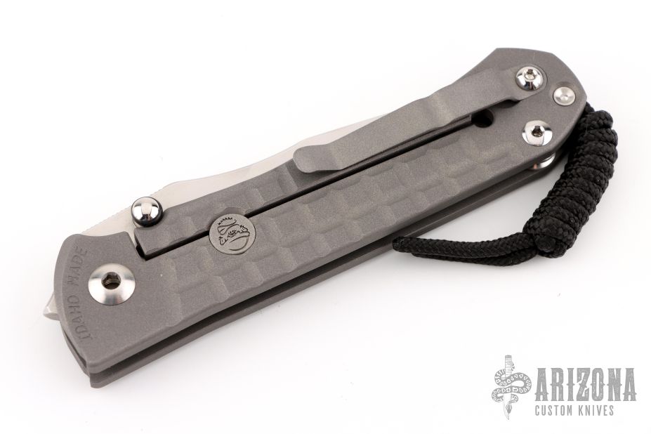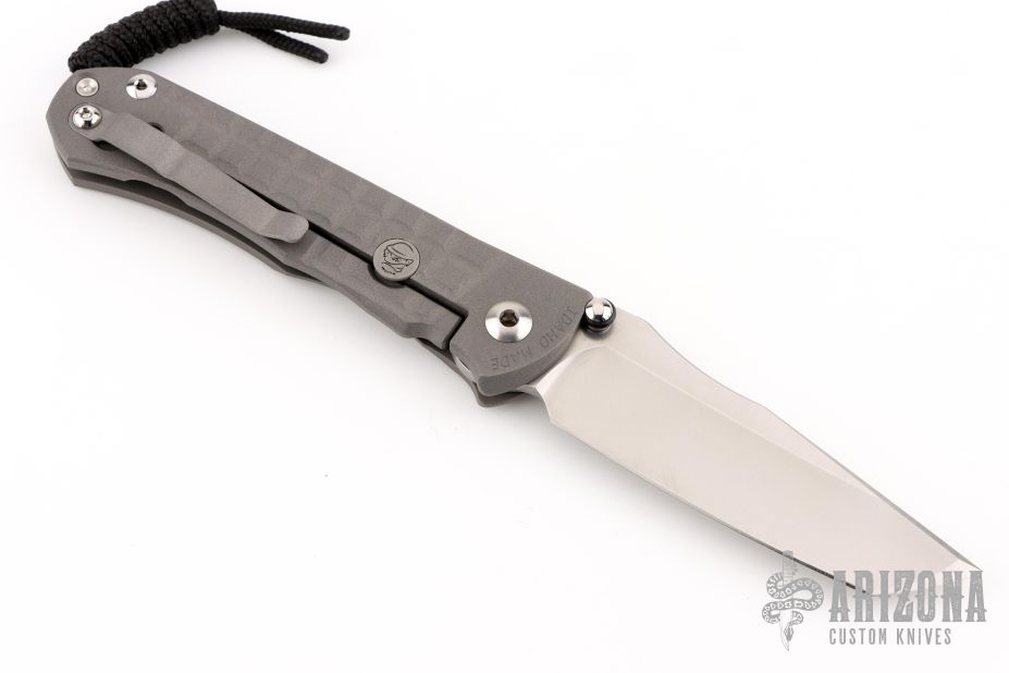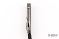 This Umnumzaan Framelock Folder by Chris Reeve Knives has a stonewashed Tanto Magnacut blade with dual thumb studs and notched thumbrest. Handle is bead blasted titanium with titanium barrel spacer, titanium tip up clip, and lanyard hole. This knife has the Monkey Edge Frag Pattern. Nice detent, lockup and blade seating. Includes the original box and papers, dated January 3, 2024. New condition.