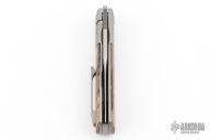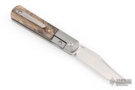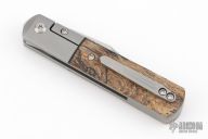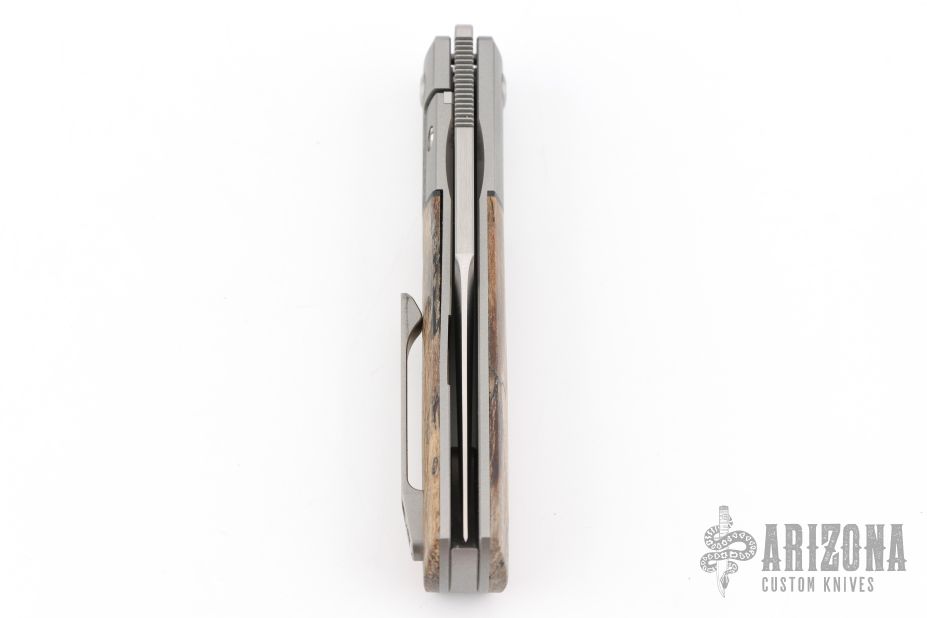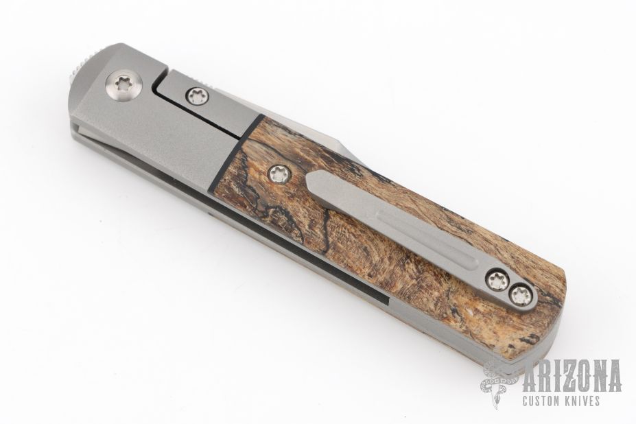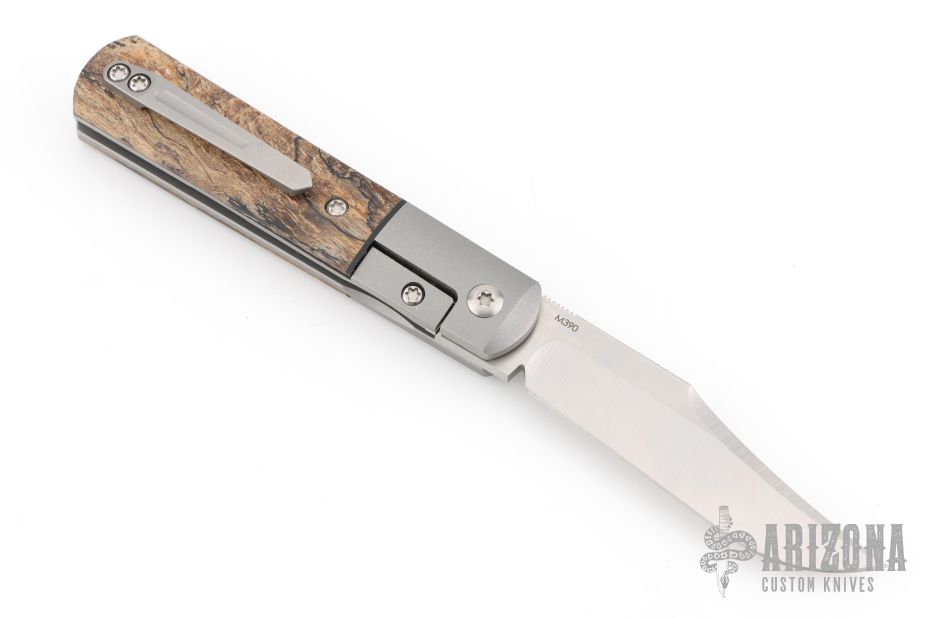 This Apache Front Flipper by Enrique Pena features a satin finished blade with a front flipper and notched thumbrest. The handle has titanium bolsters, spalted wood scales with a titanium backspacer and matching tip up pocket clip. Excellent condition. Comes with original box.