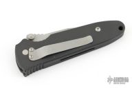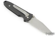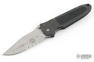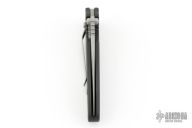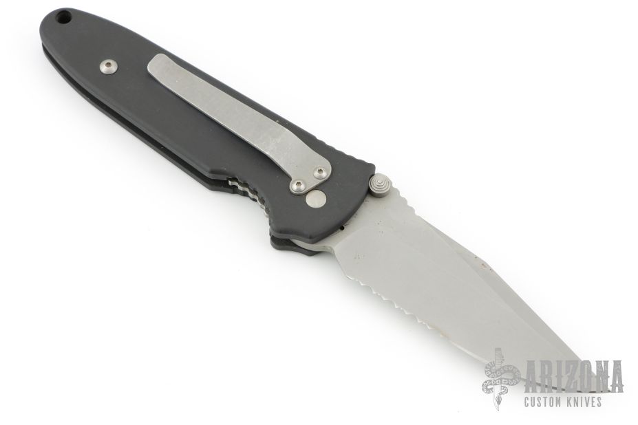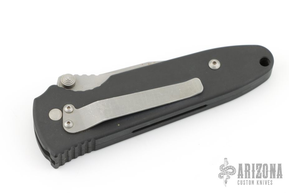 This Janich Tempest linerlock by Masters of Defense has a bead blasted blade with notched thumbrest, partial serrations, and dual thumbstuds. Handle is dark aluminum with non-slip inserts and a stainless steel tip down clip. Has scuffs, scratches and a little rust on the blade. Good condition otherwise.