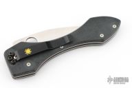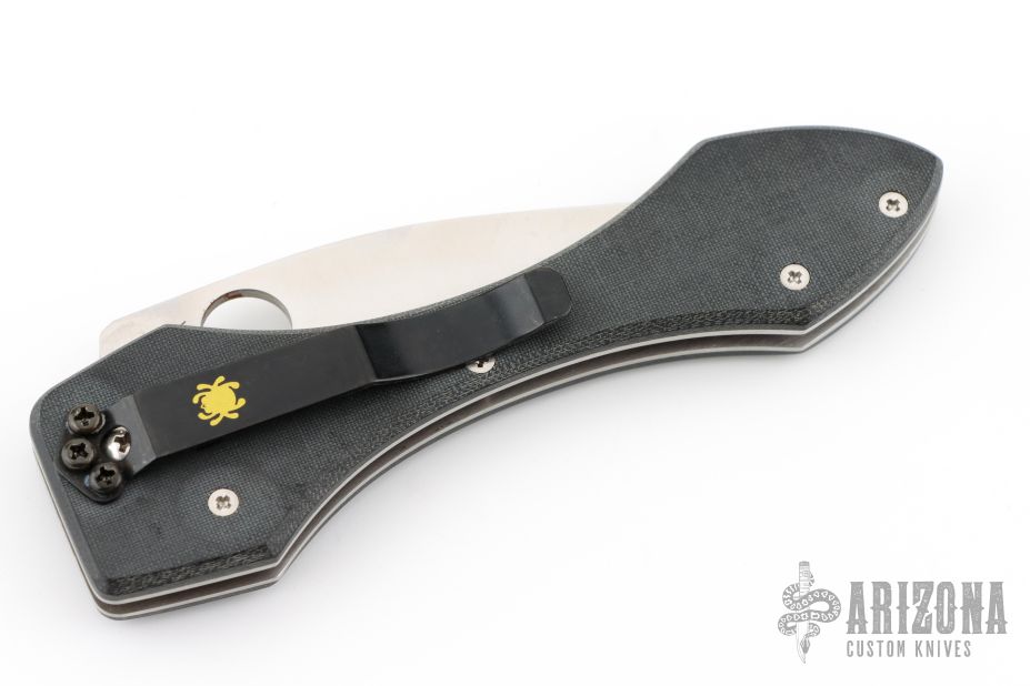 This Shabaria by Spyderco features a satin finished recurve blade with thumbhole. The handle has black linen micarta scales, stainless liners, and a black stainless tip down clip. Has a couple light scuffs, otherwise excellent condition.
