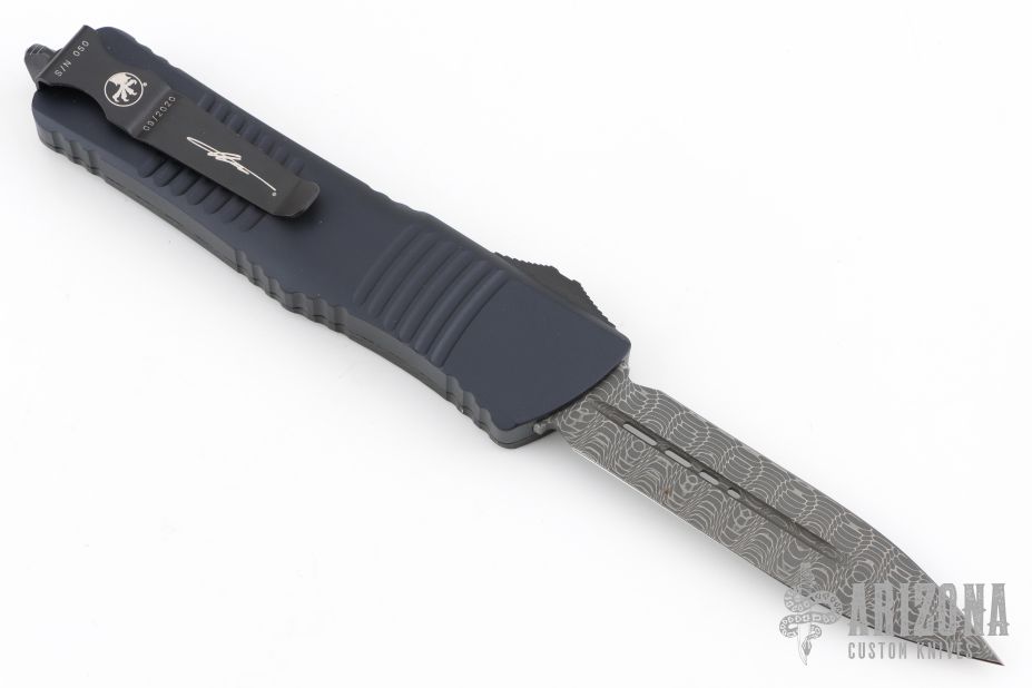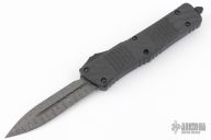 This Combat Troodon by Microtech Knives features a Damascus double edged blade. The handle is black aluminum and carbon fiber, ringed anodized titanium screws, and a black stainless steel pocket clip. The handle is marked "A. Marfione" and dated 09/2020 and #050 on spine of handle and claw logo. Excellent work. Comes with original box and papers. Excellent condition.