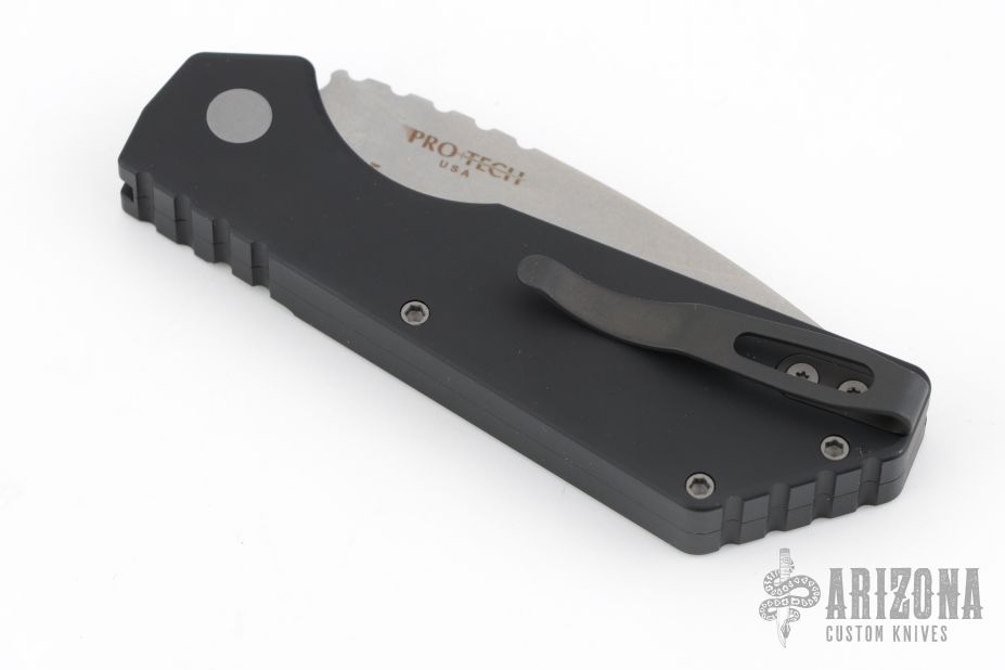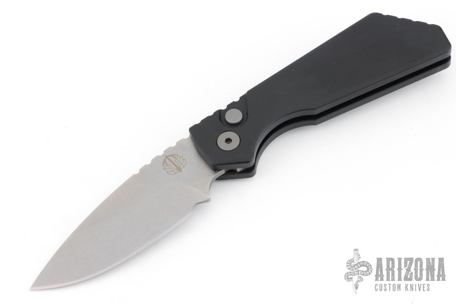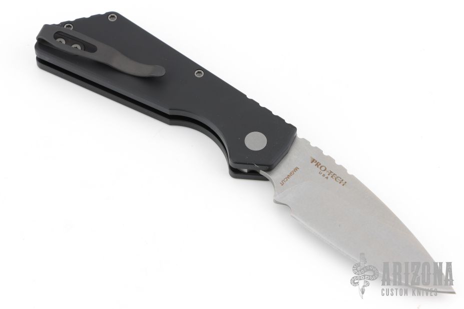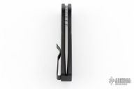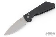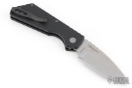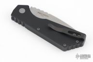 This Pro-Strider PT by Pro-Tech and Strider Knives features a tumbled finished blade with notched thumbrest. The handle has a black aluminum frame with bead blasted hardware and black stainless steel tip up clip. Includes the original box and papers. Excellent condition.