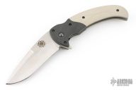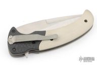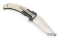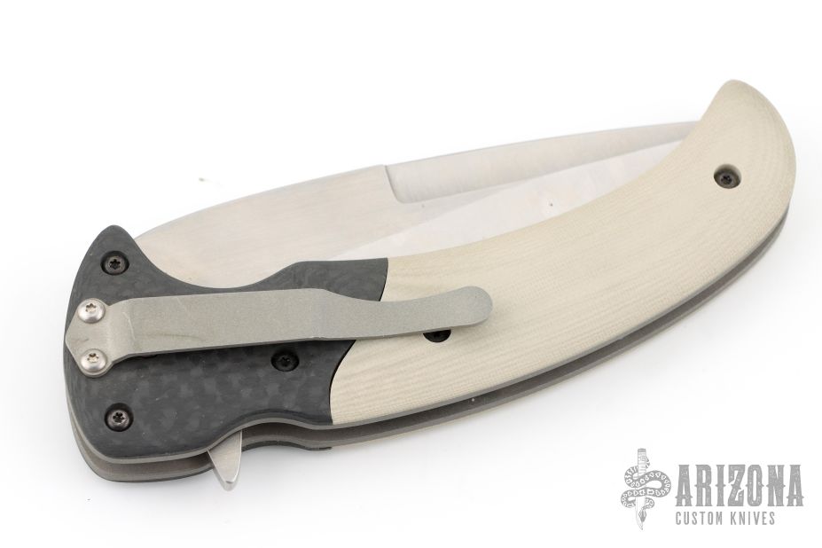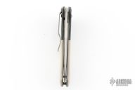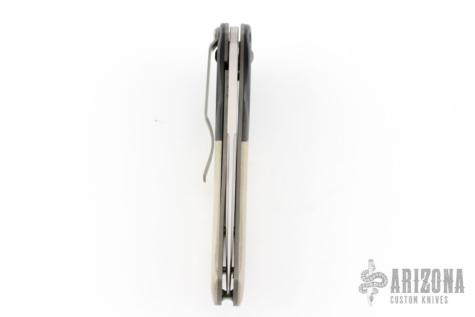 This Aftershock flipper by Brad Duncan features a satin finished blade with false top edge and flipper. The handle has bead blasted titanium bolsters, tan G-10 scales, bead blasted titanium liners and a tip down titanium clip. Rides on bearings. Nice detent, lockup and blade seating. Has some light scuffs and scratches, otherwise excellent condition.