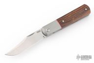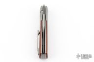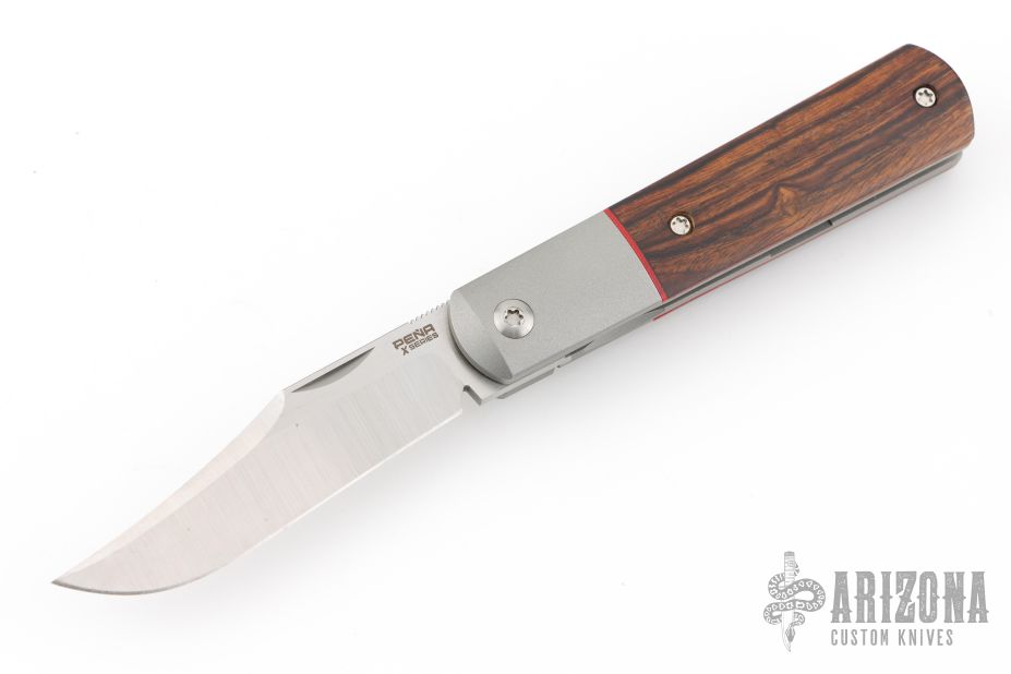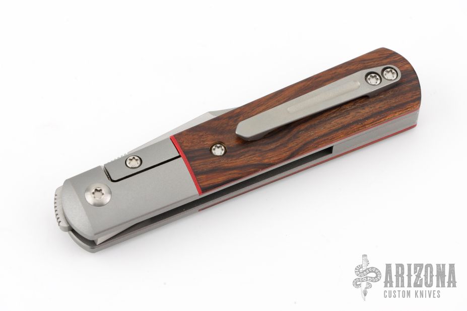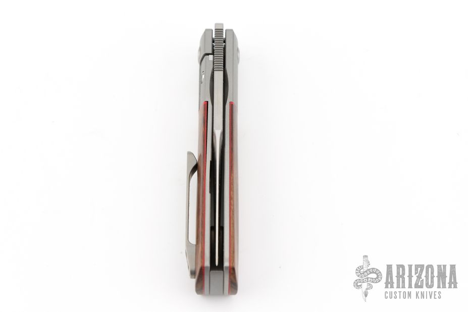 This Apache Front Flipper by Enrique Pena features a satin finished blade with a front flipper and notched thumbrest. The handle has titanium bolsters, desert ironwood scales with red liners, titanium backspacer and matching tip up pocket clip. Excellent condition. Comes with original box.