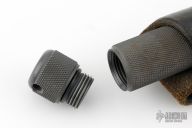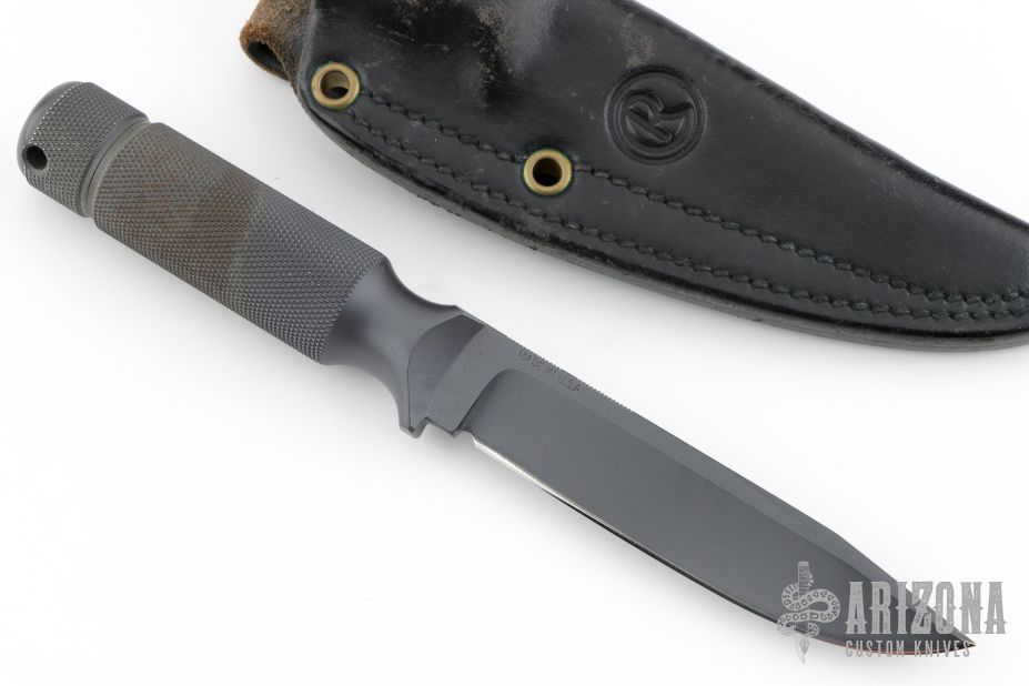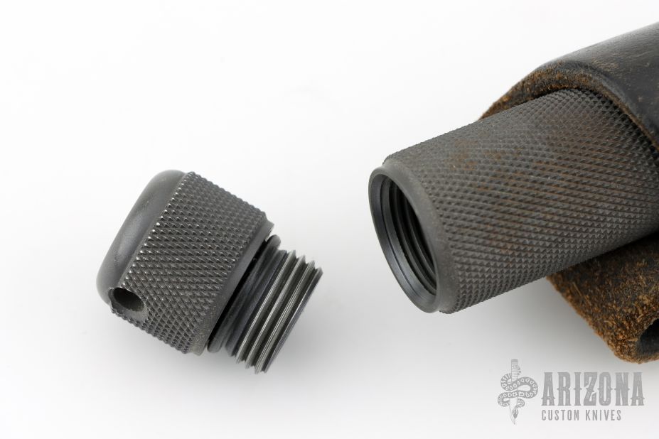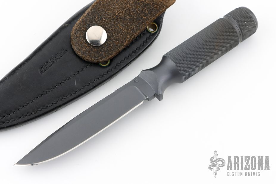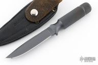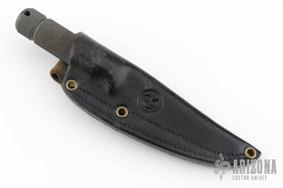This Mountaineer I by Chris Reeve features a clip point blade with swedge and notched thumbrest, .183" blade stock and 0.885" blade depth. The handle is comprised of a one-piece hollow construction with threaded/removable butt cap. Lanyard and lanyard hole in pommel. Includes leather sheath with belt loop. Has a couple light scuffs, otherwise excellent condition.