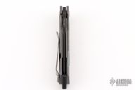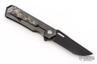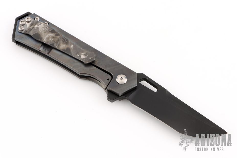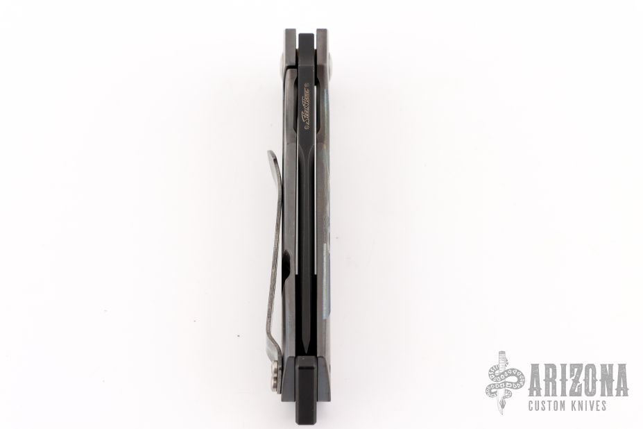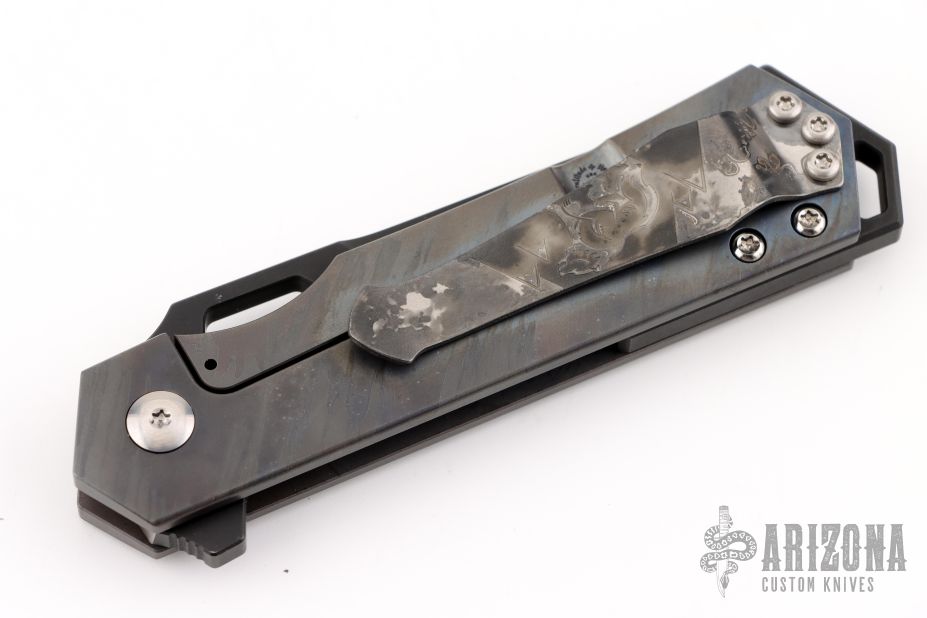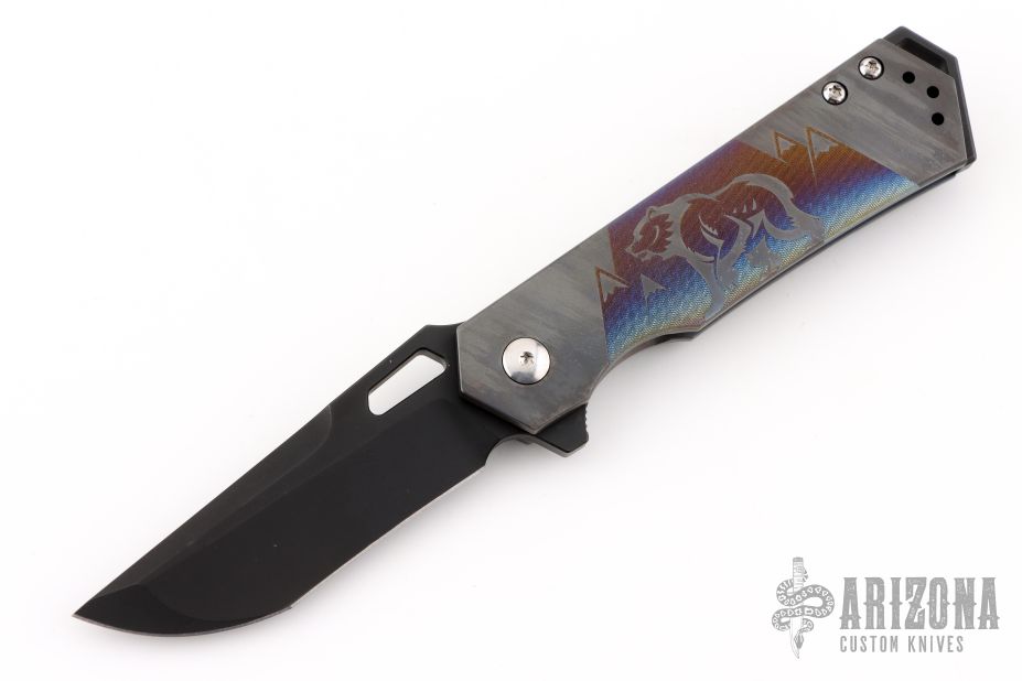 This Hagakure framelock flipper by Steel Flame features a black tumble finished tanto recurve blade with flipper. The handle has a bead blasted titanium frame with laser engraved California Bear, and a laser engraved tip up clip, black titanium backspacer with lanyard hole. Nice detent, lockup and blade seating. Comes with Velcro case and COA #29. Excellent condition.