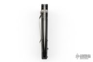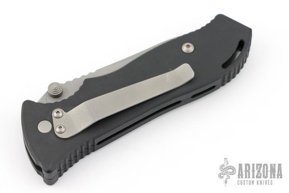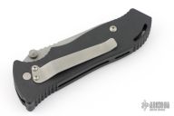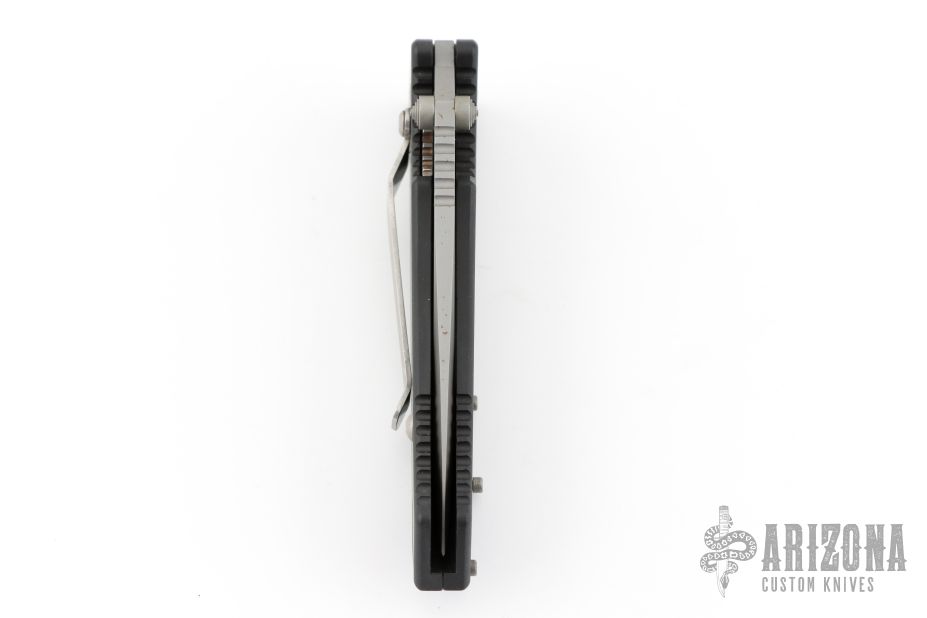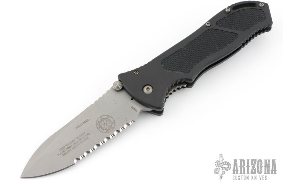 This Trident Utility Folder from Masters of Defense features a bead blasted spear point blade with swedge, notched thumb rest, dual thumb studs and partially serrated edge. The handle is comprised of black anodized aluminum with non slip inlays on the "A" side over an inlaid steel lockbar. Lanyard hole in pommel. Bead blast finished tip down clip. Has some scuffs and scratches, and a little rusting on the blade. Good condition otherwise.