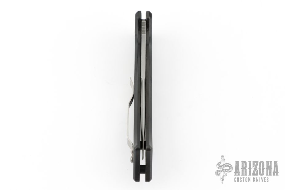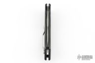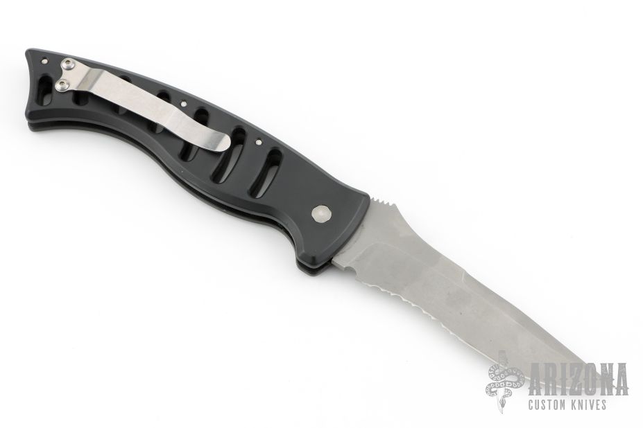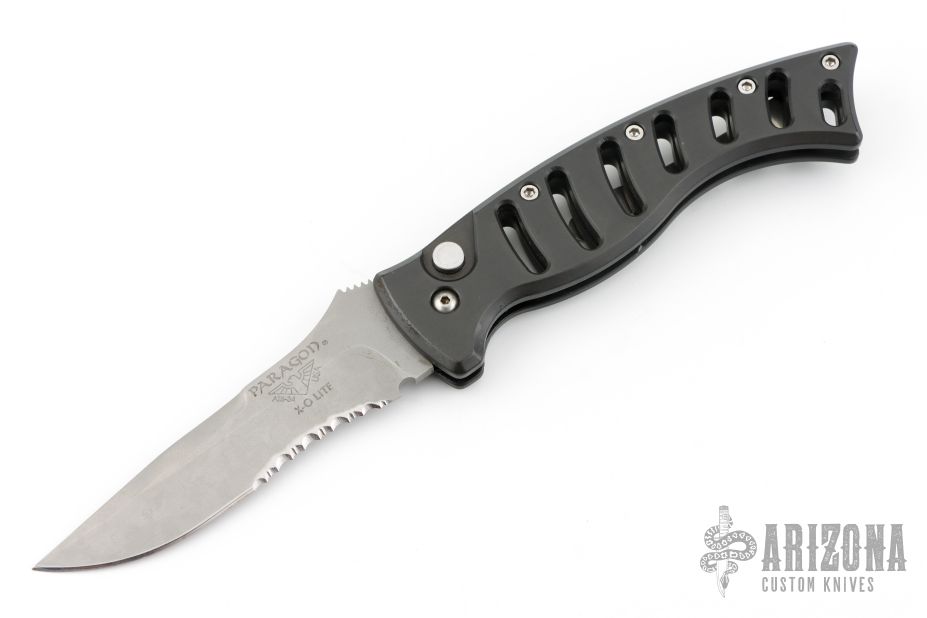 This Paragon X-O Lite auto has a blasted recurve partially serrated blade with notched thumbrest and false top edge. Handle is black anodized aluminum with a push button. Has some light scratches, otherwise good condition.
