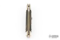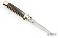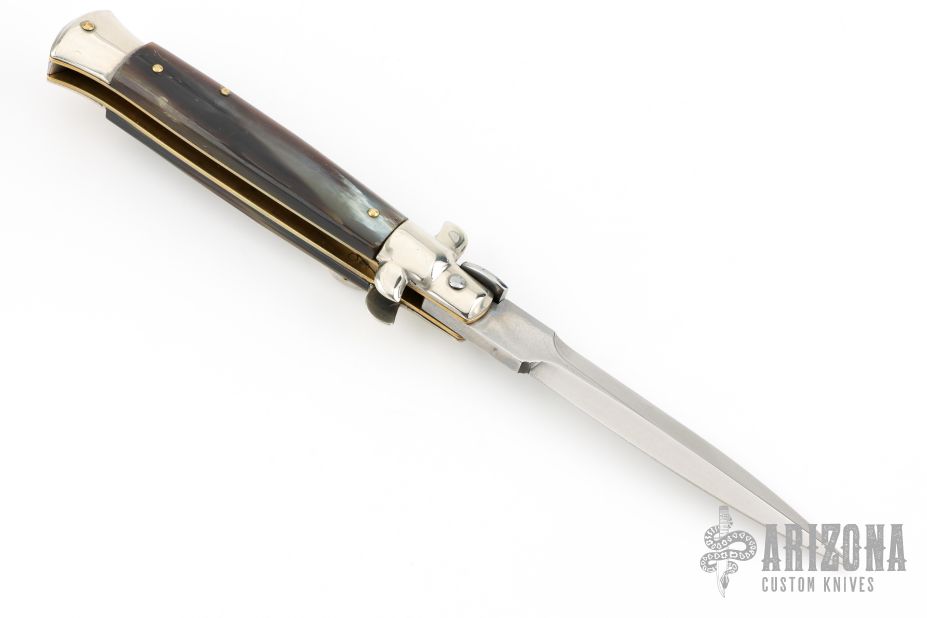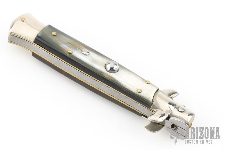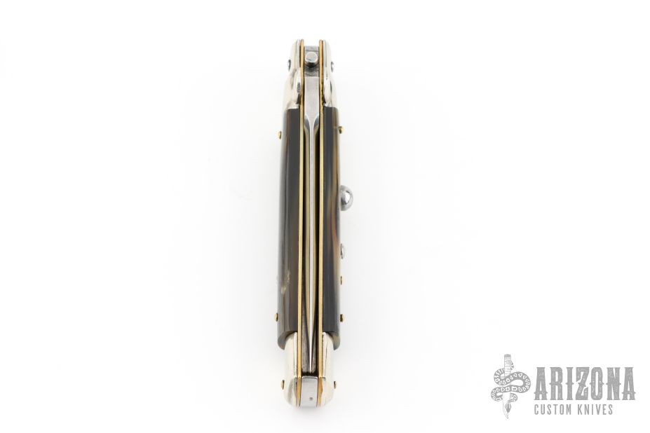 This swivel bolster auto by Latama features a spear point blade with a false top edge. Aluminum guard and rear bolster and White/Black Brazilian horn scales, brass liners and stainless steel backspacer. Nice function, strong firing and lock up. Excellent condition.