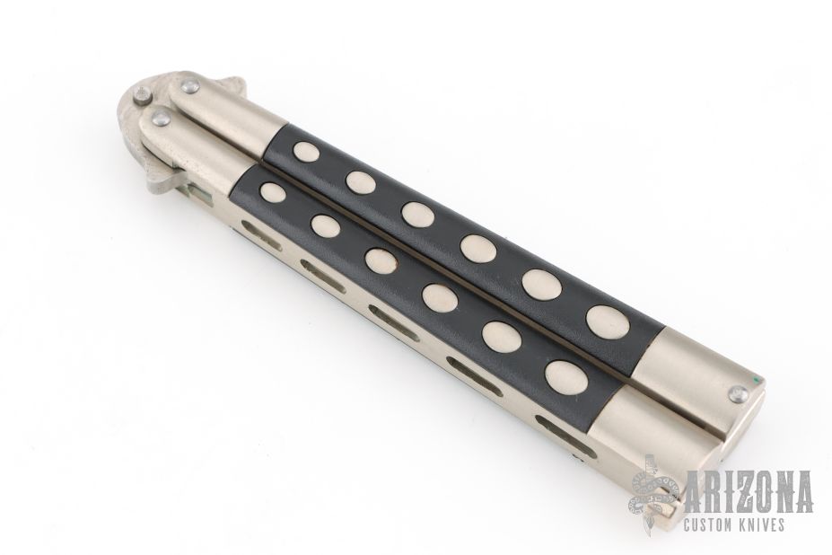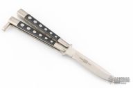 This International Series Utility Balisong has a satin finished stainless steel blade (marked 1985). Handle is steel with black plastic inlays. Excellent condition.