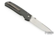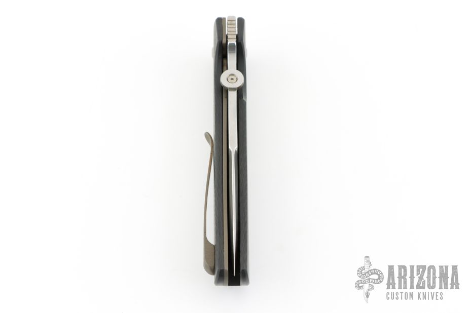 This ATCF linerlock folder by Bob Terzuola features a bead blasted spear point blade with notched thumbrest and thumbdisc. The handle has carbon fiber scales, a bead blasted and anodized single titanium liner, black backspacer, and tip up bead blasted and anodized titanium clip. Smooth action. Nice lockup, detent and seating. Has a couple light scuffs, otherwise Excellent condition.