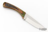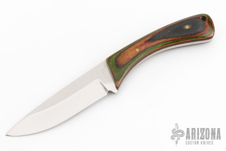 This knife by "RG" features a mirror polished blade with .157" blade stock and 1.0656" blade depth, full tang construction. The handle has pakkawood scales with brass pins and lanyard hole. #9615 on the blade. Excellent condition. Please let us know if you know who RG is.