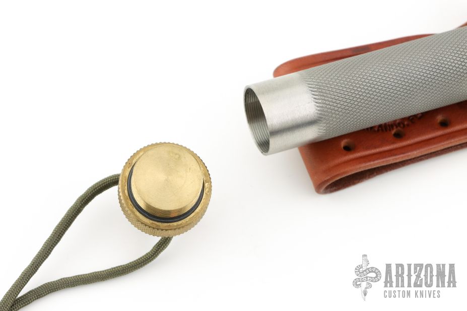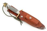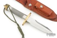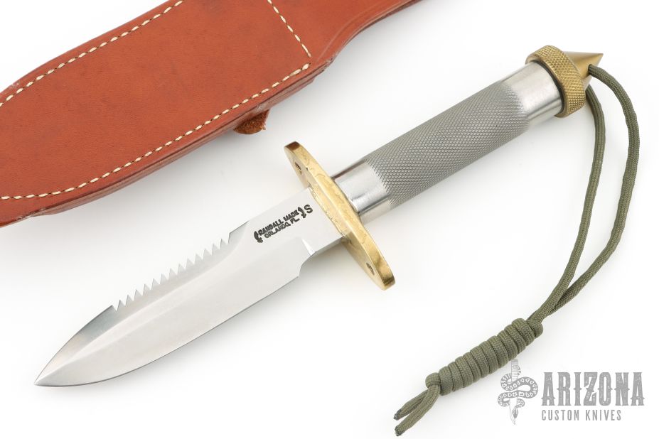 This Model 18-5.5 Attack Survival from Randall Made Knives has a spear point blade with sharpened top edge and sawteeth, .218" blade stock and 1.252" blade depth, hidden tang construction. The handle has a brass guard and knurled, spike butt cap, knurled stainless steel handle. Comes with original leather sheath. Has some patina and light scuffs, excellent condition.