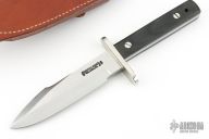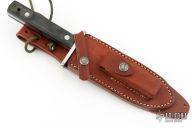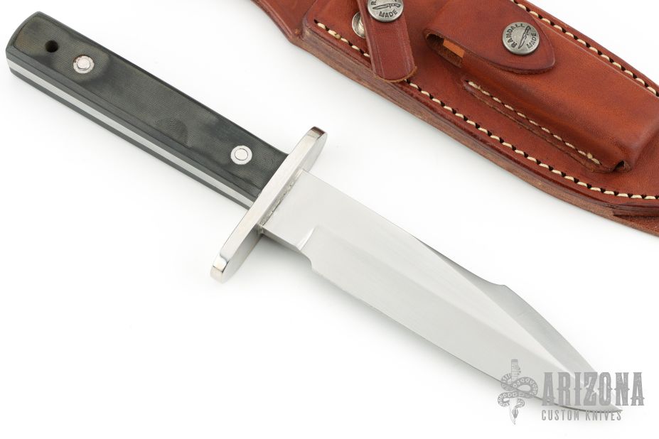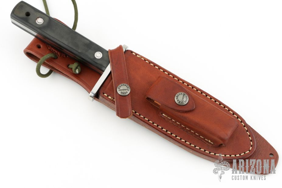 This Model 17 Astro by Randall features a satin finished spear point blade with false top edge, .216" blade stock, 1.273" blade depth, full tang construction. Stainless steel guard, black linen micarta scales, fastened with removable stainless steel bolts. A slot in the heavy tang and matching hollow inside the handle may be used to carry matches, fishhooks, line and other survival items. The Model 17 was especially designed for the seven Mercury astronauts who carried them on America's first manned space flights. Astronaut Gordon Cooper did the final design, and two of these historically valuable knives are on display in the Smithsonian Institution. Includes original brown leather sheath with stone. Has a couple light scuff, Excellent condition.