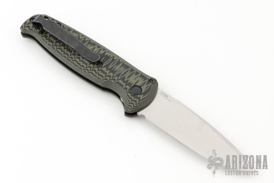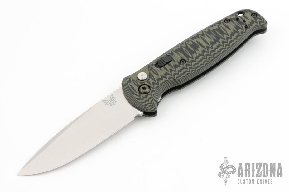 The CLA Composite Lite Auto by Benchmade Knives features a stonewashed drop point blade with a notched thumbrest. The handle has a G10 frame with a black steel tip-up pocket clip. Includes the original box and papers. Excellent Condition.