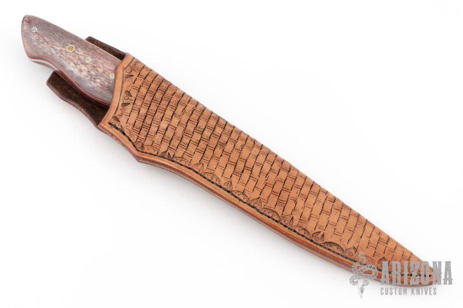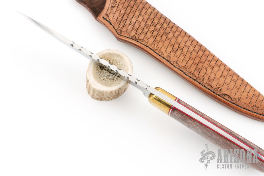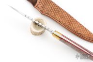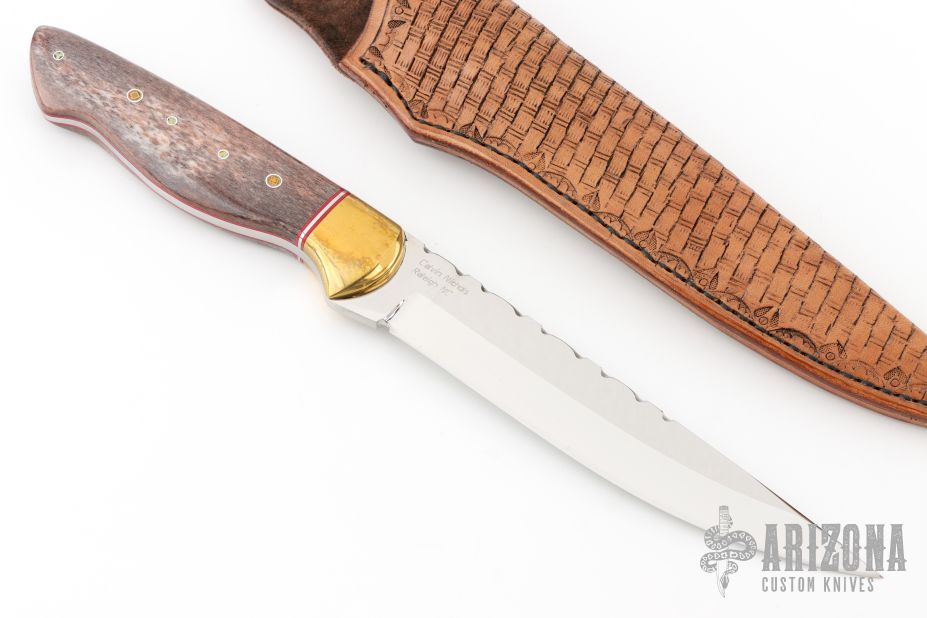This hunter by Calvin Nichols features a mirror polished drop point blade with fileworked spine, .193" blade stock and 1.107" blade depth, full tapered tang construction. The handle has brass bolsters, giraffe bone scales, red/stainless steel spacers and red liners, mosaic pins. Comes with a hand tooled brown leather sheath and a zippered case. Excellent condition. Originally from the 2018 ICCE.