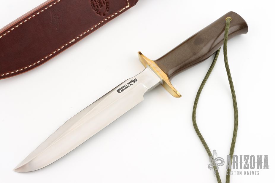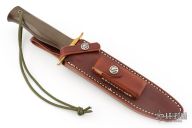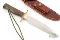 This Model 16 Special Fighter from Randall Made Knives has a satin finished stainless steel clip point blade with sharpened top edge, .223" blade stock and 1.260" blade depth, full tang construction. Handle has green linen micarta handle, brass guard and lanyard tube. Comes with a brown leather sheath and a zippered case. Excellent condition.