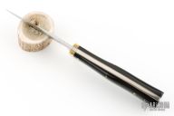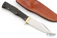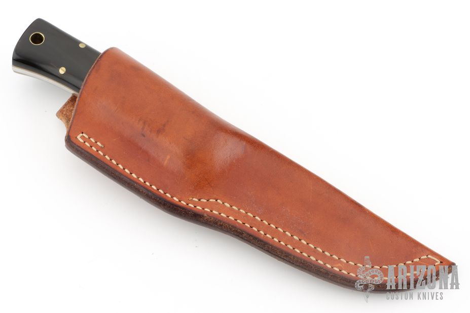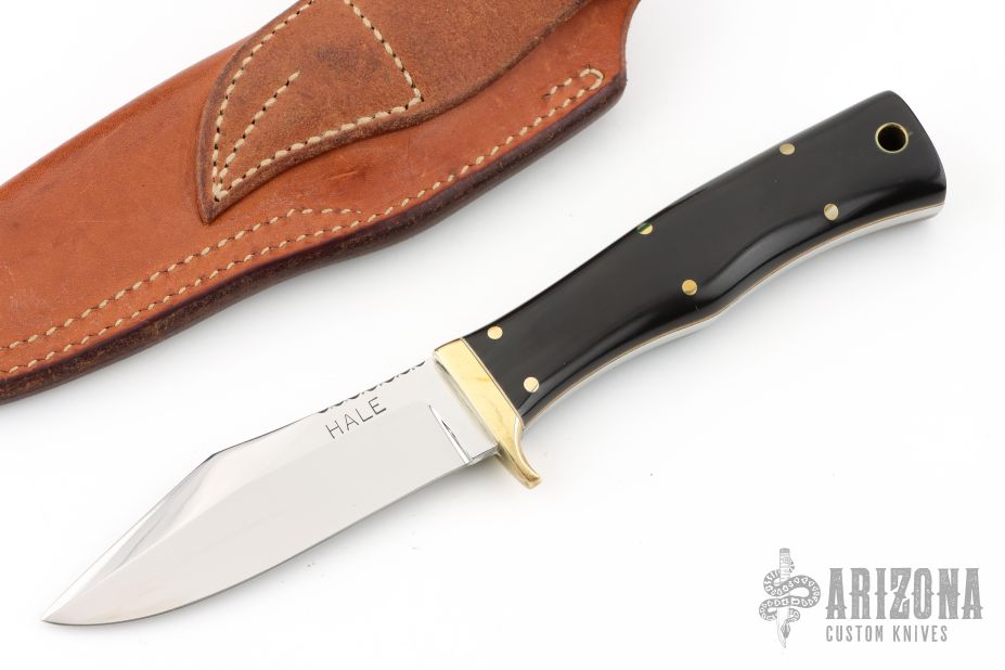 This small hunter by Lloyd Hale features a polished clip point blade with sharpened top edge, fileworked spine and notched thumbrest, .117" blade stock and .766" blade depth, full tapered tang construction. The handle has a brass guard, buffalo horn scales with brass pins and white liners, lanyard hole at the butt. Comes with a brown leather sheath and a zippered case. Has a little chip in the b-side scale, otherwise excellent condition.