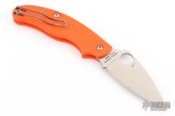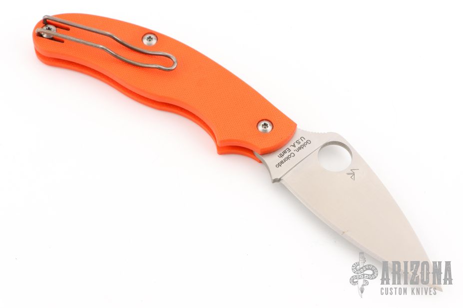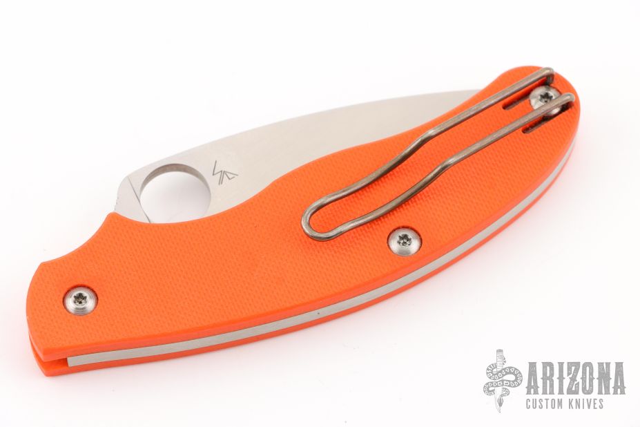 This UK Pen Knife by Spyderco features a satin finished blade with thumbhole. The handle has orange G-10 scales, stainless steel backspacer and tip up clip, left or right reversible. Comes with original box. Excellent condition.