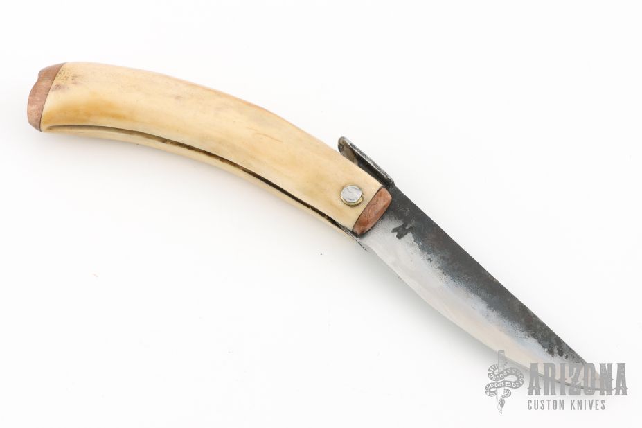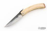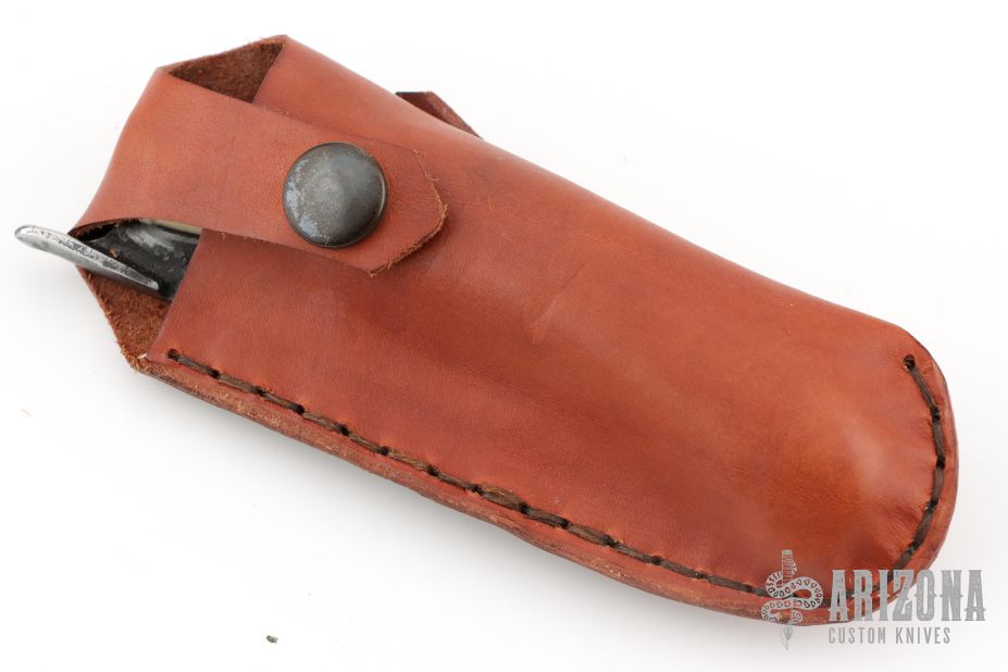 This Friction Folder features a hand forged blade with satin finish and forged finished flats. The handle is smooth ground stag with a wooden butt cap. Comes with a brown leather sheath and a zippered case. Has some scratches, otherwise excellent condition.
