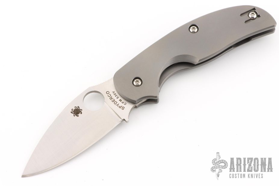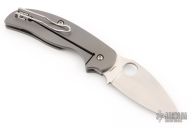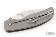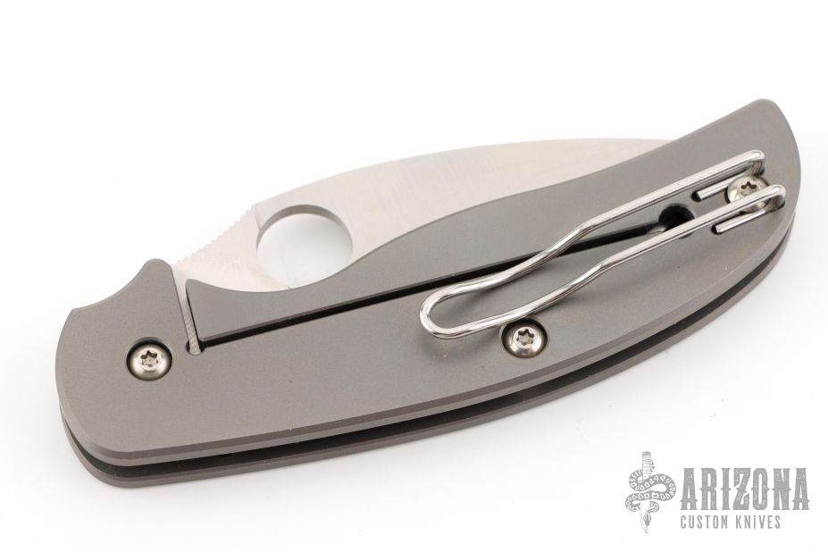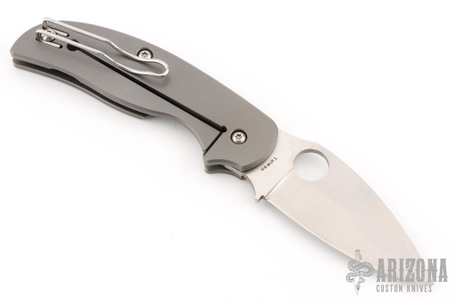 This Sage II by Spyderco has a satin finished blade with thumb hole and notched thumbrest. The handle has a bead blast finished titanium frame with tip up, right or left, stainless steel clip. Comes with original box and papers. Excellent condition.