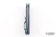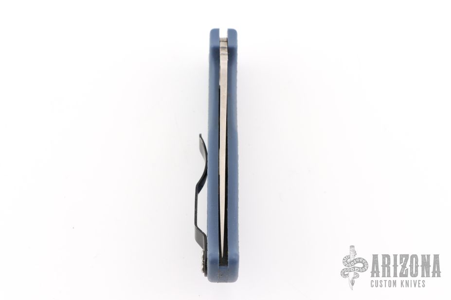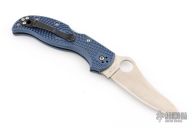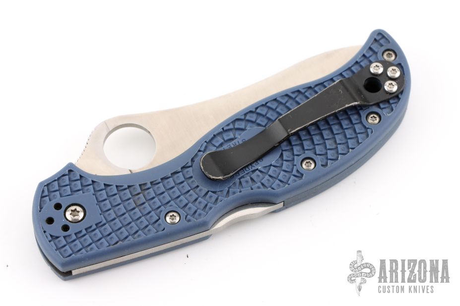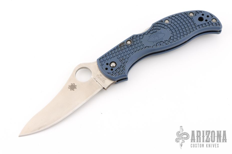 This Stretch lock back folding knife by Spyderco features a ZDP-189 satin finish blade with a thumbhole and notched thumbrest. The handle has a blue FRN frame and a 4-way reversible stainless steel clip. Has some scuffs and scratches, and a little rust on the blade; great condition otherwise.