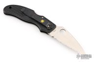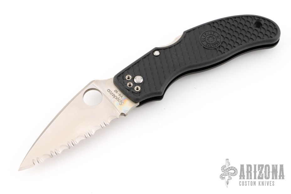 This Spyderco Calypso Jr. is a discontinued model with a satin finished blade with a fully serrated edge and FRN handle. Has a couple light scuffs, excellent condition otherwise.