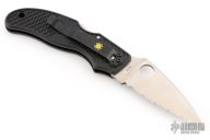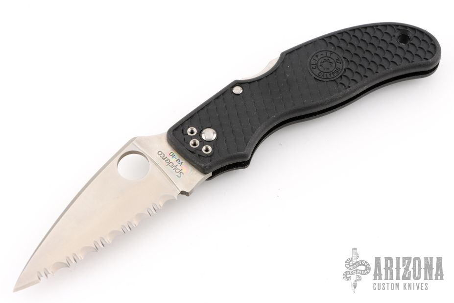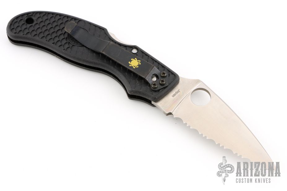 This Spyderco Calypso Jr. is a discontinued model with a satin finished blade with a fully serrated edge and FRN handle. Has a couple light scuffs, excellent condition otherwise.
