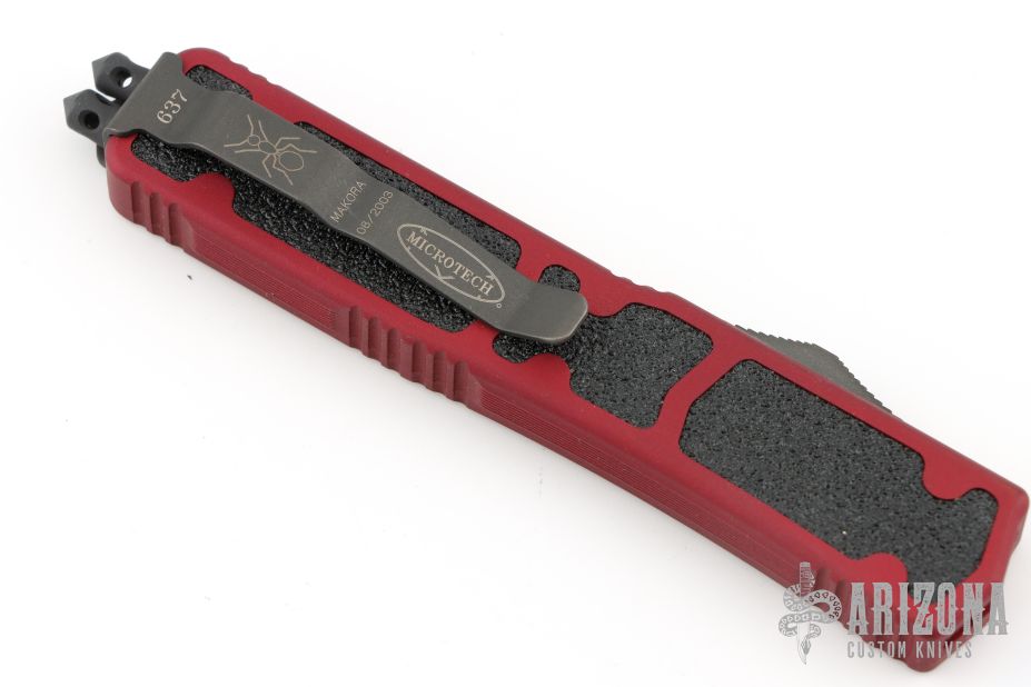 This Makora Fireant is from the 08/2003 production run and is S/N 637. It features a satin double edged blade with fullers. The handle has a red aluminum frame with non-slip inserts, black hardware, black stainless steel tip down clip and black glass breakers at the butt. Comes with a zippered case. Excellent condition.
