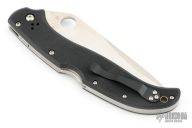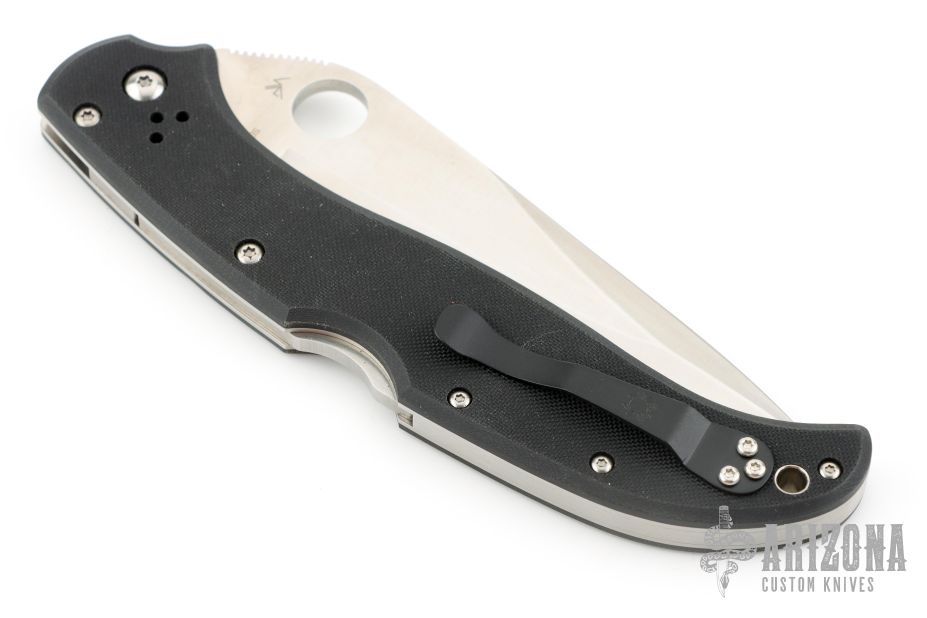 This Tatanka by Spyderco a satin finished blade with notched thumbrest and thumbhole. The handle has black G-10 scales with stainless liners and backspacer, 4-way reversible black stainless clip. Comes with original box and papers. New condition.