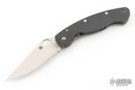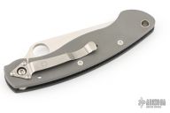 This Military Framelock by Spyderco has a satin finished blade with notched thumbrest and thumbhole. Handle is a carbon fiber and titanium frame, with a stainless steel tip down clip, and lanyard tube. Has a stainless lockface insert. New condition. Comes with original box and papers.