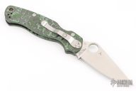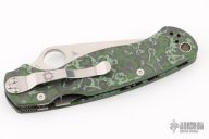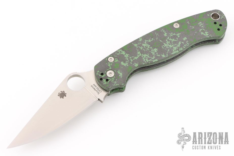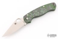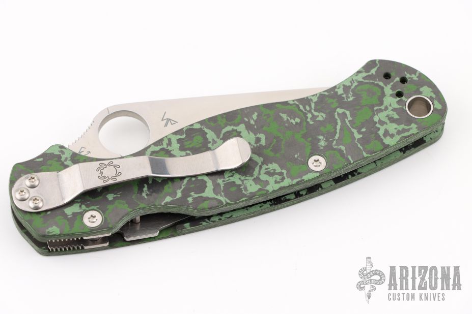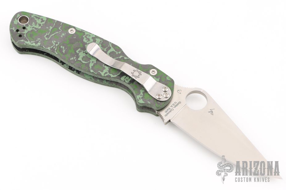 This Paramilitary 2 Linerlock Folder from Spyderco has a satin finished clip point blade with thumb hole and notched thumb rest. Handle has black/green Fat Carbon scales with stainless steel liners and stainless steel 4-way reversible clip. Comes with original box and papers. New condition.