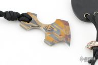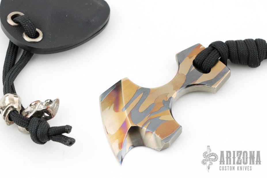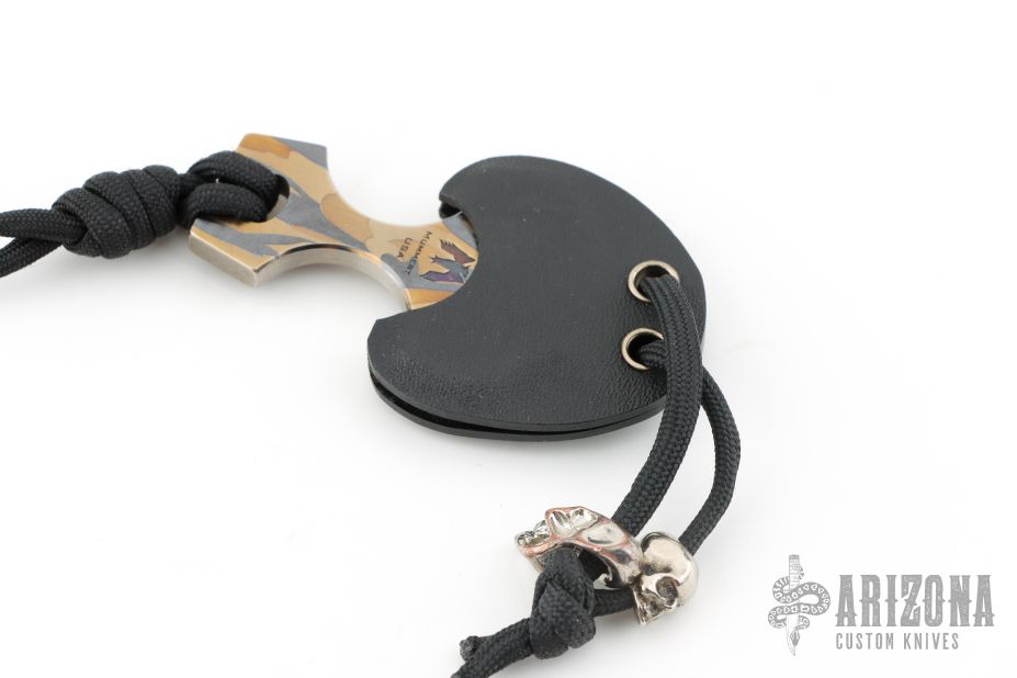 Designed to be a small cutting tool or a backup defensive weapon that is easily carried anywhere, this spunk from Mummert Knives delivers an amazing amount of cutting ability in a small package. The Spunk is constructed out of .205” thick 6Al-4V titanium with tungsten carbide fused to the edge attaining a Rockwell hardness of 72 at the razor sharp edge.  This knife features a midnight camo finish.  Includes a kydex sheath, bead chain and the original packaging.  Excellent Condition.