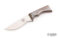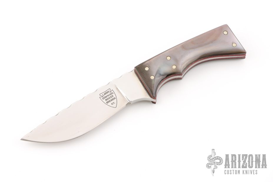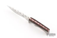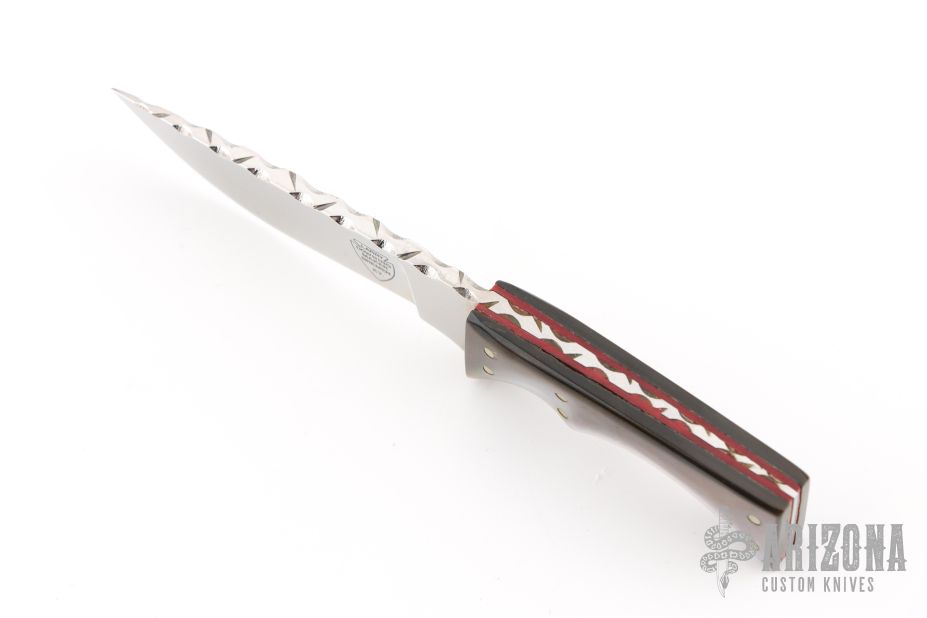 This knife by Larry Downing features a mirror finished blade with a file worked blade spine, .107" blade stock and .572" blade depth, tapered tang construction with black lip covers, red liners and nickel silver pins. Comes in a felt slip. Has a couple light scratches, excellent condition.