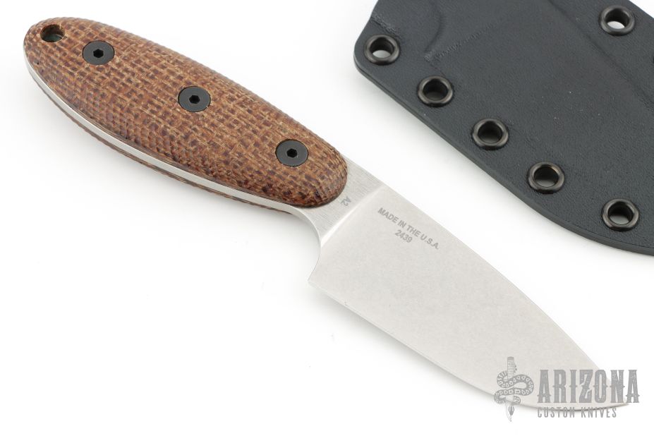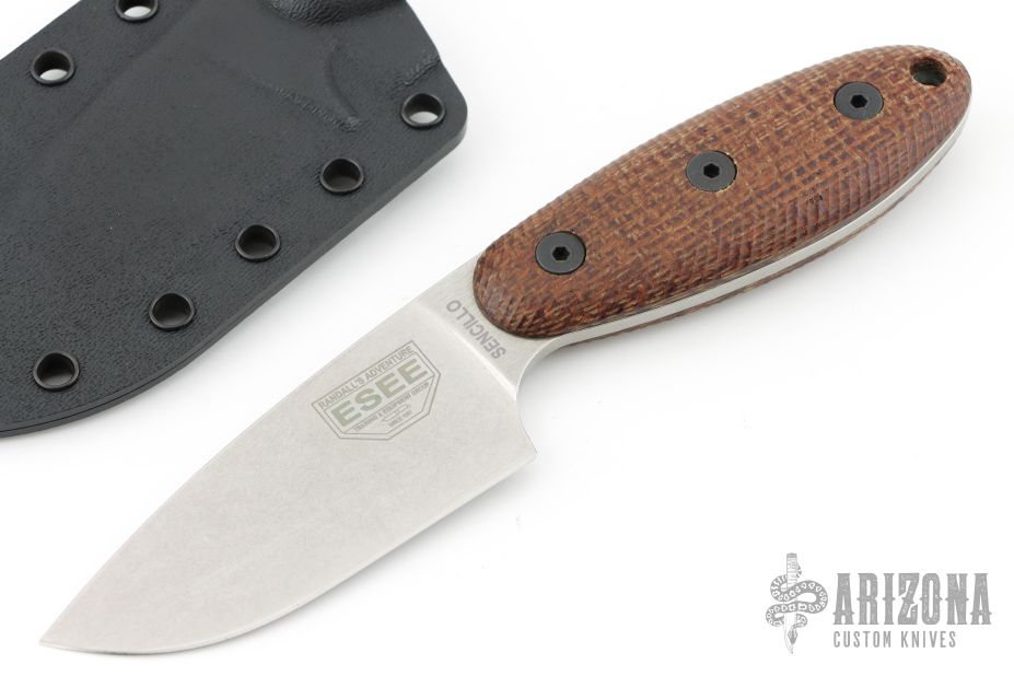 This Sencillo by Esee Knives features a stonewashed blade with a full tang construction. The handle has custom burlap micarta scales. Comes with a kydex sheath. Excellent Condition.