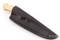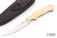 This Skinner by George Englebretson features a hand rub satin polish blade with .089" blade stock and .791" blade depth, full tang construction. The handle has a steel guard, bone covers, black liners, and nickel silver pins. Thumb notches on the spine. Comes with a leather sheath. Has a couple light scratches and patina, otherwise great condition. Tip is slightly chipped.