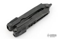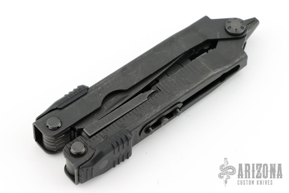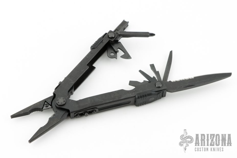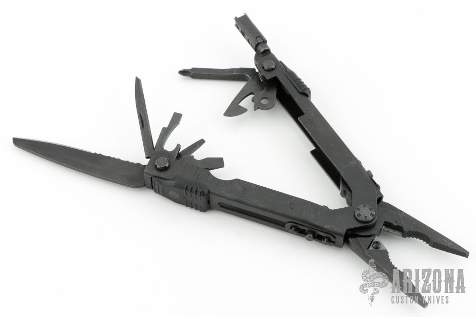 This Multi-Plier contains: Needlenose pliers, wire cutters, serrated knife, small/ med/ lg flat blade screwdrivers, can opener, bottle opener, file, lanyard loop, and phillips head screwdriver. Includes a nylon sheath. Has some scuffs/scratches, otherwise excellent condition.
