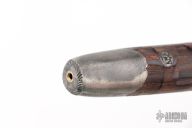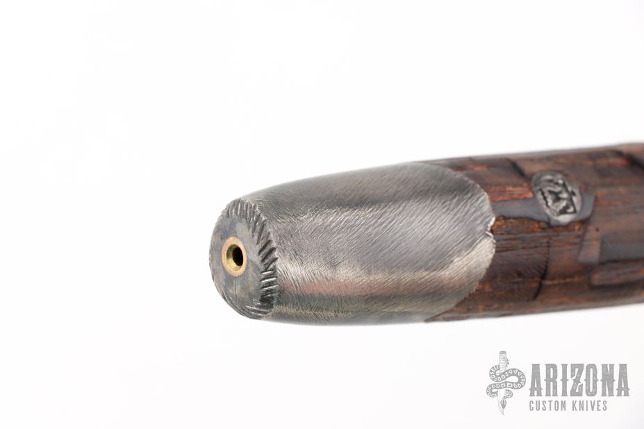 The Handle: Turned from Ashat the GoldPoint Forge on the Defiance 1904 Lathe with its signature texture and given a reddish brown finish with a functional draft hole through the handle. File branding details and pewter end caps.