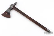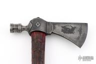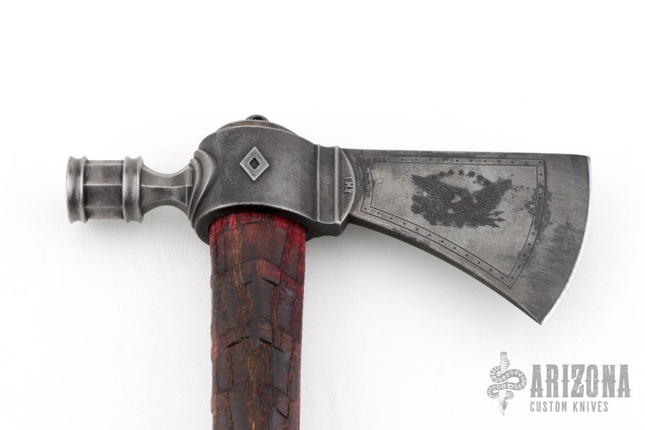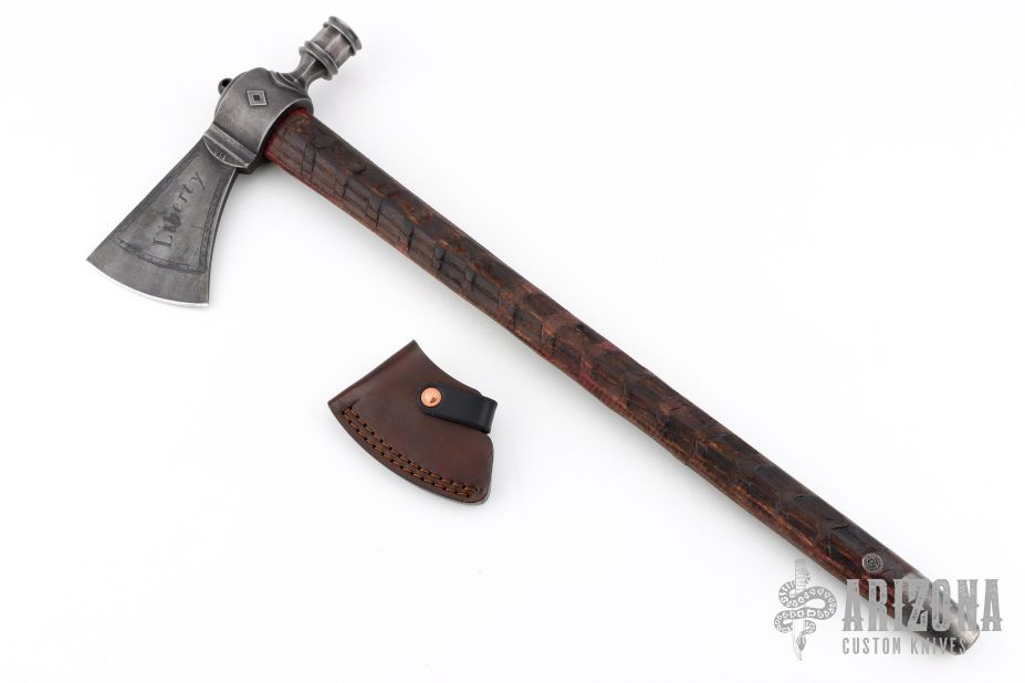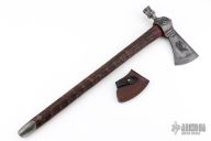 The folks over at RMJ Tactical specialize in making kicka$$ tomahawks and gear, for all sorts of situations and scenarios. The Patriot pipe tomahawk is a wicked blend of new and old school manufacturing techniques mixed with the classic historical pipe hawk design to create a killer tomahawk that not only looks great but is functional in all aspects. The head is investment cast from 6150 tool steel and finished off with a dark patina'd finish and working bowl and stem so you and the boys can toke up at the next powwow. The handle has been turned from ash at the Gold Point forge on Ryan's Defiance 1904 lathe and features the signature texture that the Defiance lathe is known for, that provides some sweet looks and a not too aggressive but secure grip. If you do decide to rip your favorite plant out of it, the handle has a threaded 17-4 stainless steel clean out plug. Comes with a custom leather edge cover with copper rivets.
