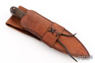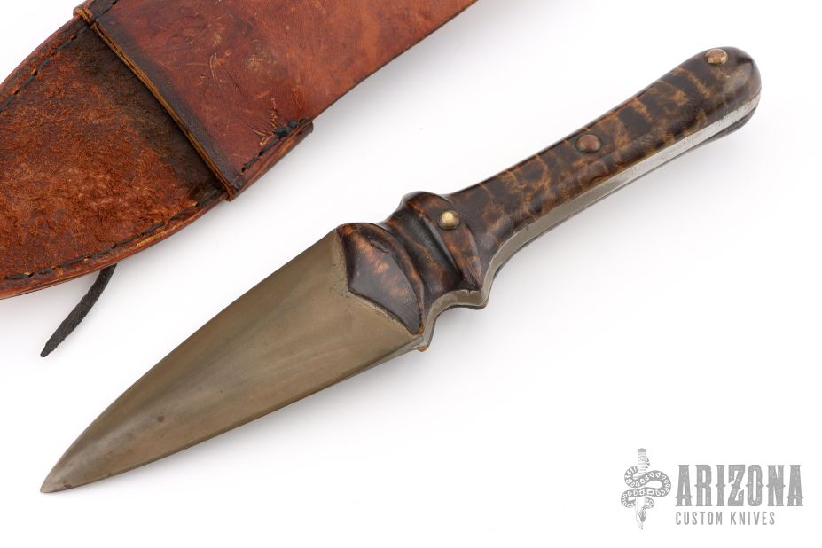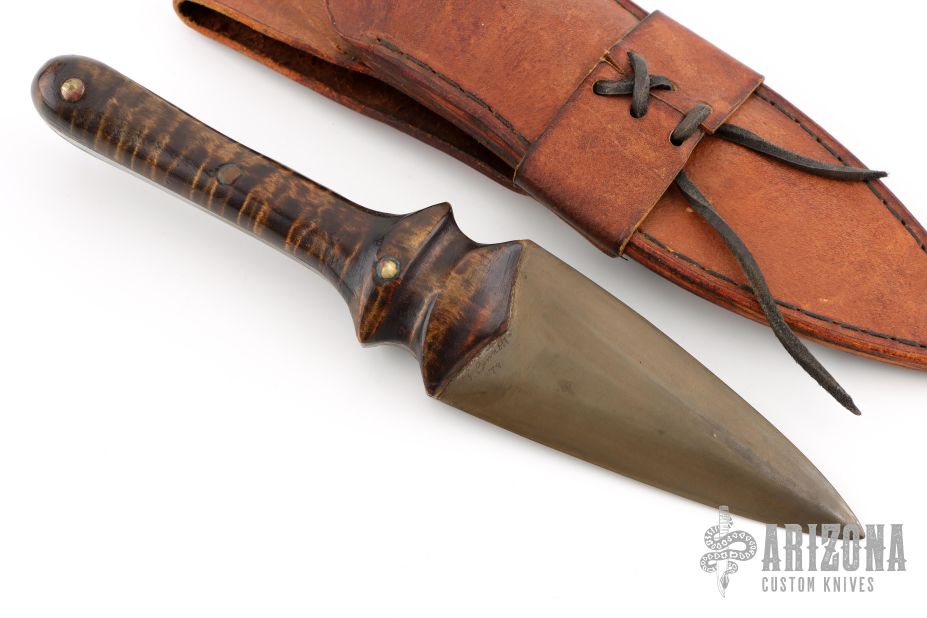 This knife by T. Bennett has a distressed finished double edged blade with .290" blade stock, 1.84" depth, full tang construction. The handle has pinned wood covers. Comes with a brown leather sheath. Has some light scuffs and scratches, great condition otherwise. Marked '88 on the knife next to the makers mark.