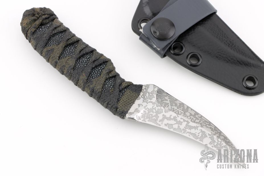-5/32" thick CPM154. Watson Knives' thermal process includes -Oxygen free austenize, triple temper, cryogenically quench, hardness test 3x.