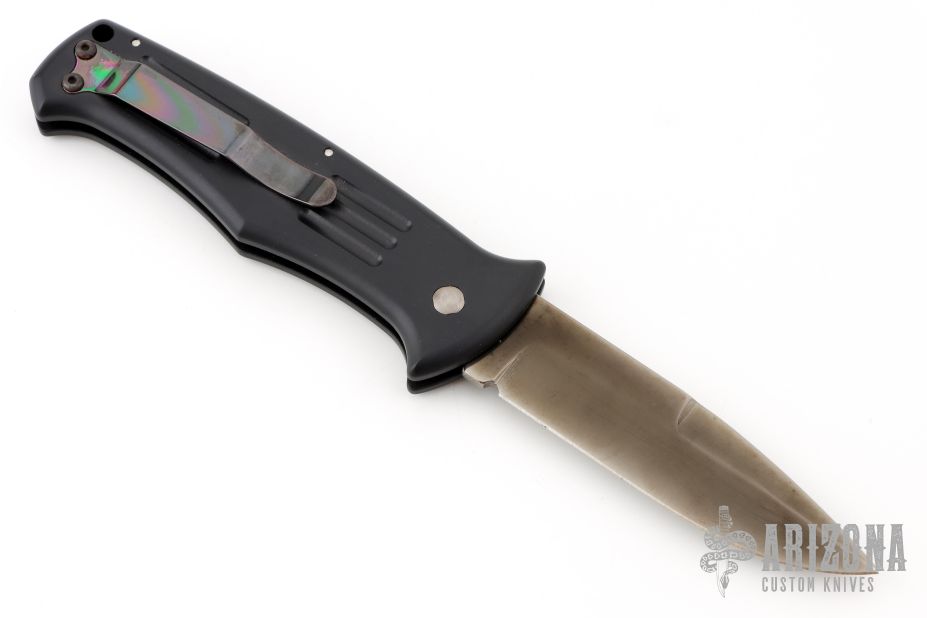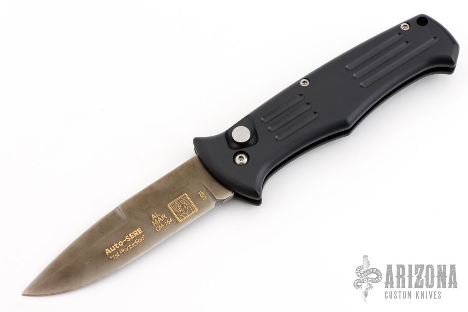 This Auto-SERE by Al Mar Knives features a black coated drop point blade with swedge. The handle is comprised of black anodized and machined aluminum with a black coated, steel tip up clip positioned for right hand carry. Lanyard hole in pommel. Marked "1st Production" on blade. Comes with original clamshell box. Has a few light scratches on the clip, otherwise excellent condition.