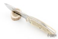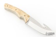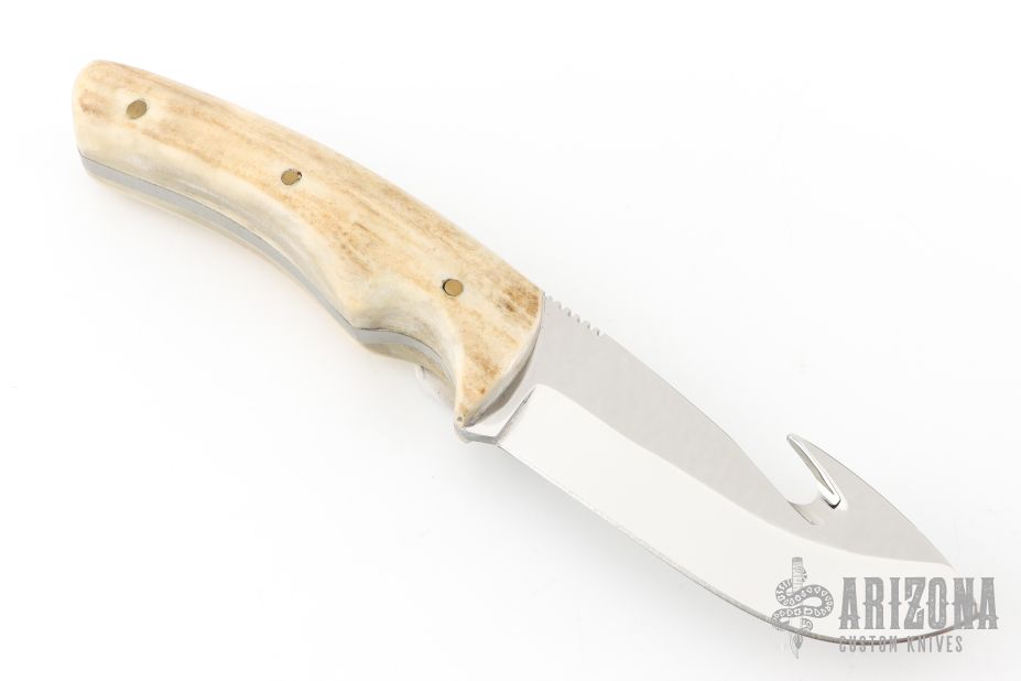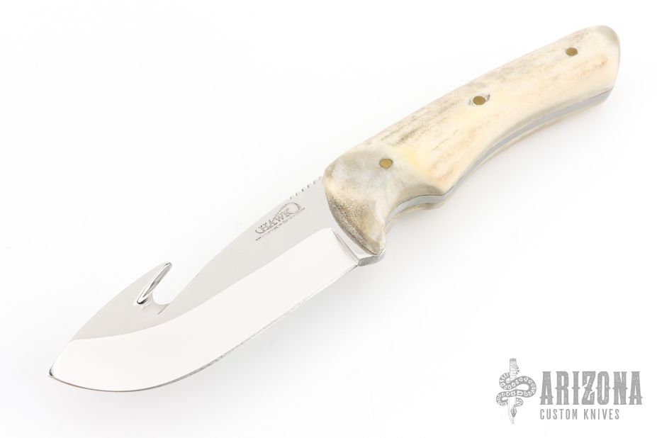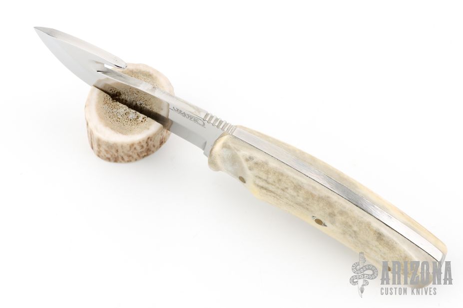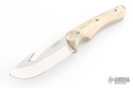 This gut hook skinner by "HAWK" (please let us know if you know who this is) features a mirror finished blade with gut hook and thumb rest, .197" blade stock and 1.498" blade depth, full tang construction. The handle has pinned bone slabs. Has some light scratches, otherwise excellent condition.