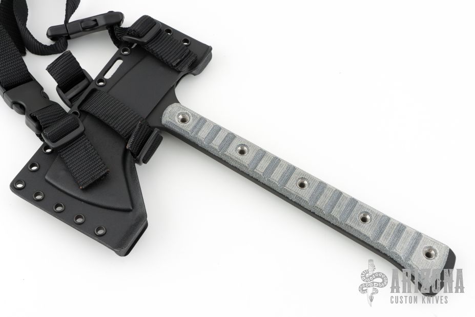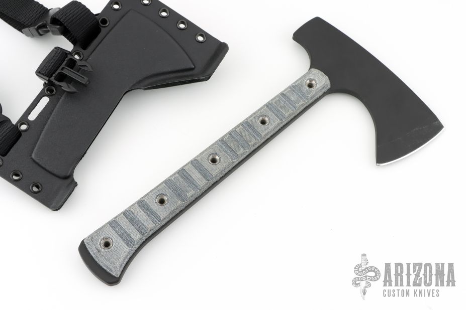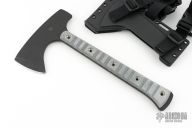 This MidTech Woodsman Tomahawk by James Helm features a Cerakote finish 3" blade and a hammer poll at the rear, .275" blade stock, full tang construction. The handle has Tero Tuf slabs and flared stainless tube rivets. Comes with a kydex sheath that has a buckle and strap. New from Maker!