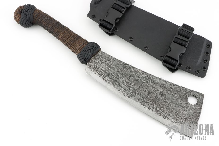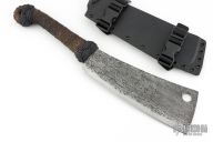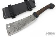 This Cleaver by James Helm features a hand forged clip point upswept blade with .261" blade stock and 3.3" blade depth, hidden tang construction. The handle has hemp/cord wrap. Comes with a kydex sheath. New from Maker!