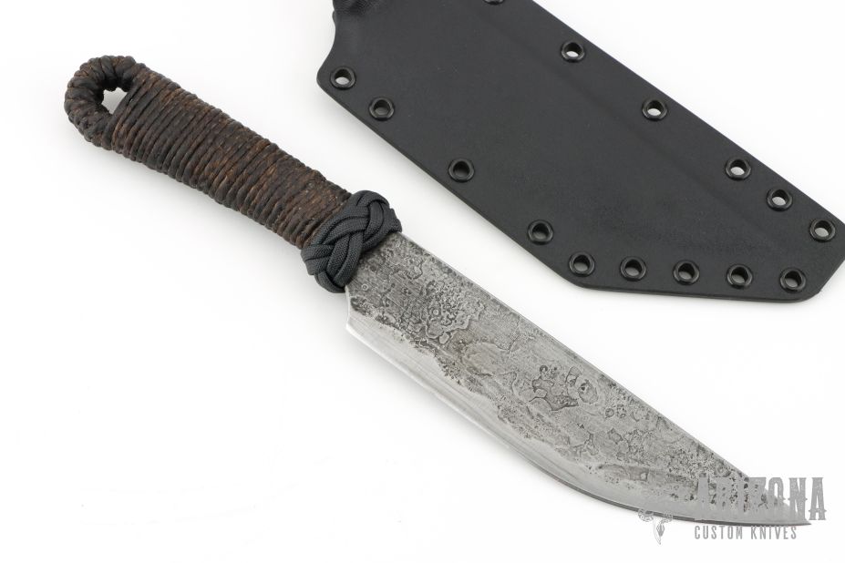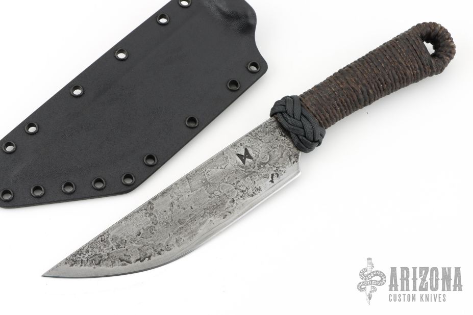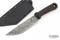 This knife by James Helm features a hand forged blade, .132" blade stock and 1.653" blade depth, hidden tang construction. The handle has a paracord/hemp wrap that has been epoxied. Comes with a kydex sheath set up for TekLok. New from Maker!