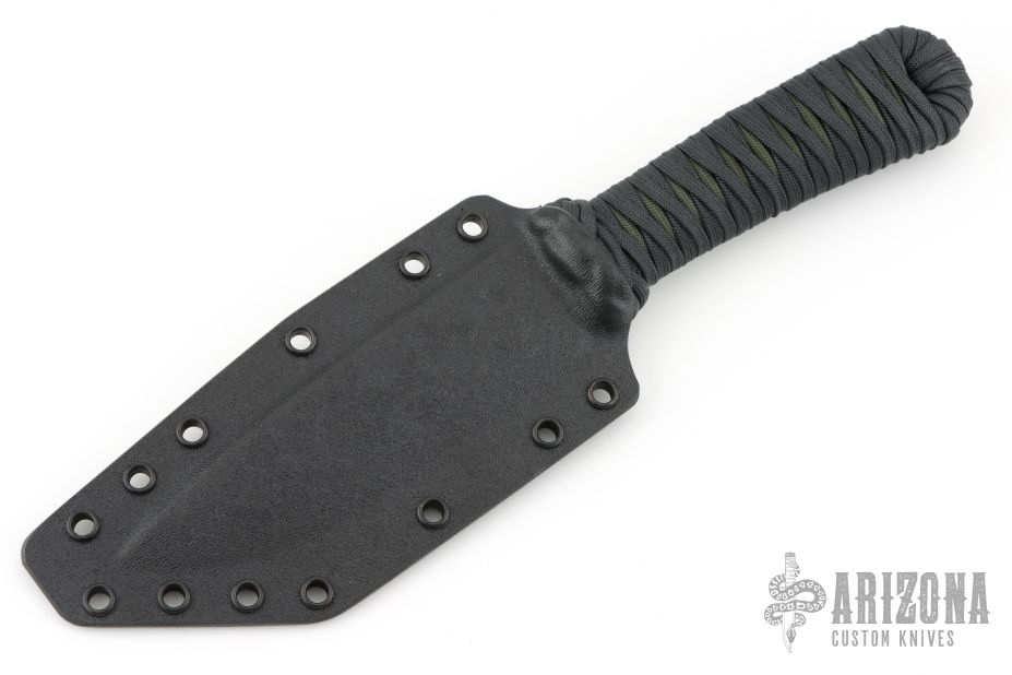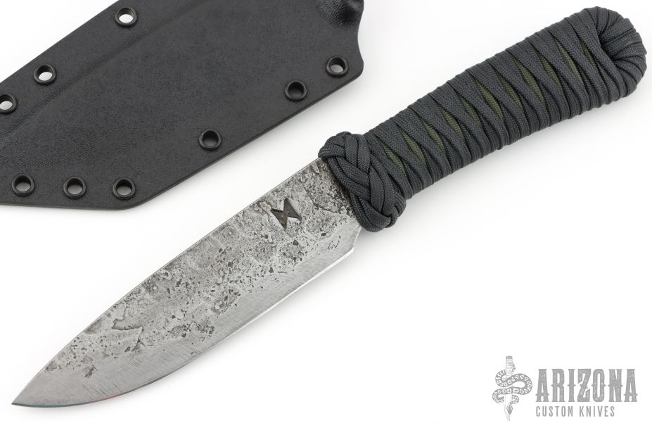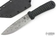 This knife by James Helm features a hand forged blade, .144" blade stock and 1.429" blade depth, hidden tang construction. The handle has a paracord wrap that has been epoxied. Comes with a kydex sheath set up for TekLok. New from Maker!